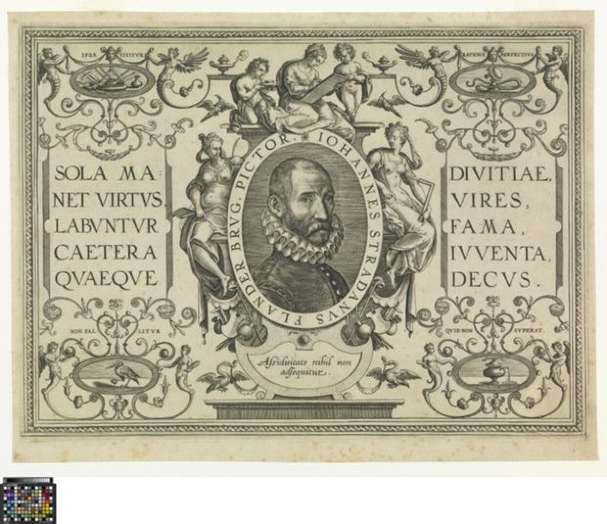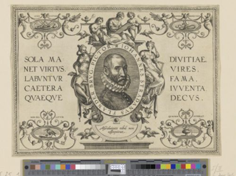 16de eeuwBusteportret van Johannes Stradanus in een ovale lijst met rondom groteske ornamenten. De lijst is versierd met personificaties van de Schrijfkunst, Tekenkunst en Geometrie. In de vier hoeken van de prent zijn emblemen weergegeven. Deze prent maakt deel uit van de reeks 'Passie, dood en wederopstanding van Christus' uitgegeven door Philips Galle in Antwerpen in 1585-86 (New Hollstein Dutch 50).