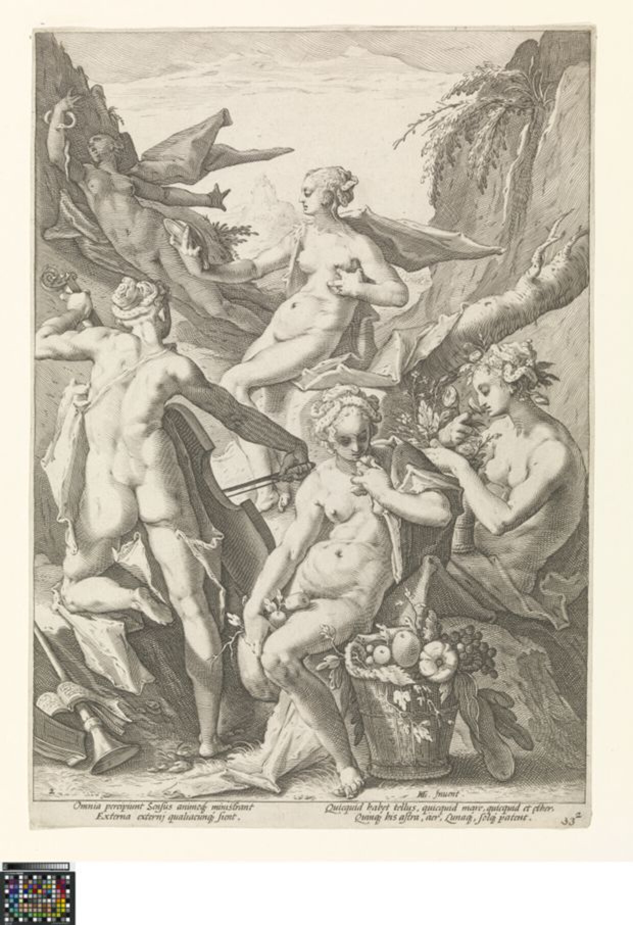 17de eeuwTweede prent uit een reeks van acht mythologische en allegorische voorstellingen (New Holl. Jacob Matham, part III, 348-355, 349 (tweede staat van twee)). De personficiaties van de zintuigen zijn in een dal afgebeeld. Midden boven kijkt 'Zicht' in een spiegel, rechts onder ruikt 'Reuk' aan een bloem, links van haar houdt 'Smaak' een vrucht bij haar mond, links van haar bespeelt 'Gehoor' een snaarinsstrument en links op de achtergrond wordt 'Tastzin' in haar arm gebeten door een slang. De prent is gemaakt door Jacob Matham naar Hendrick Goltzius. De prent is rechtsonder in de voorstelling gesigneerd. In de marge onderaan een vierregelig opschrift in Latijn.