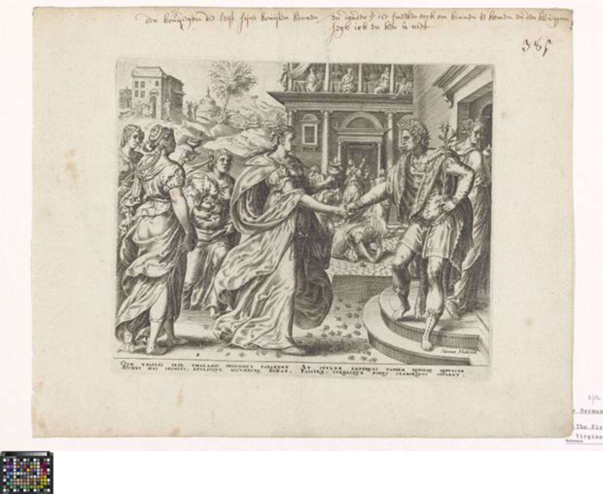 16de eeuwDe vijf wijze maagden komen met brandende olielampen aan bij de bruidegom, die de eerste de hand schudt. Links in de achtergrond zijn de vijf dwaze maagden weergegeven die olie halen. In de achtergrond rechts komen ze aan bij het huis van de bruidegom. Boven hen vindt intussen het bruiloftsmaal plaats met de vijf wijze maagden. De prent is de laatste in een vierdelige reeks over de parabel van de wijze en de dwaze maagden (New Holl. Harmen Jansz. Muller (45-48, 48). De prent is gemaakt door Herman Muller naar Gerard van Groeningen. In de marge een tweeregelig opschrift in het Latijn.