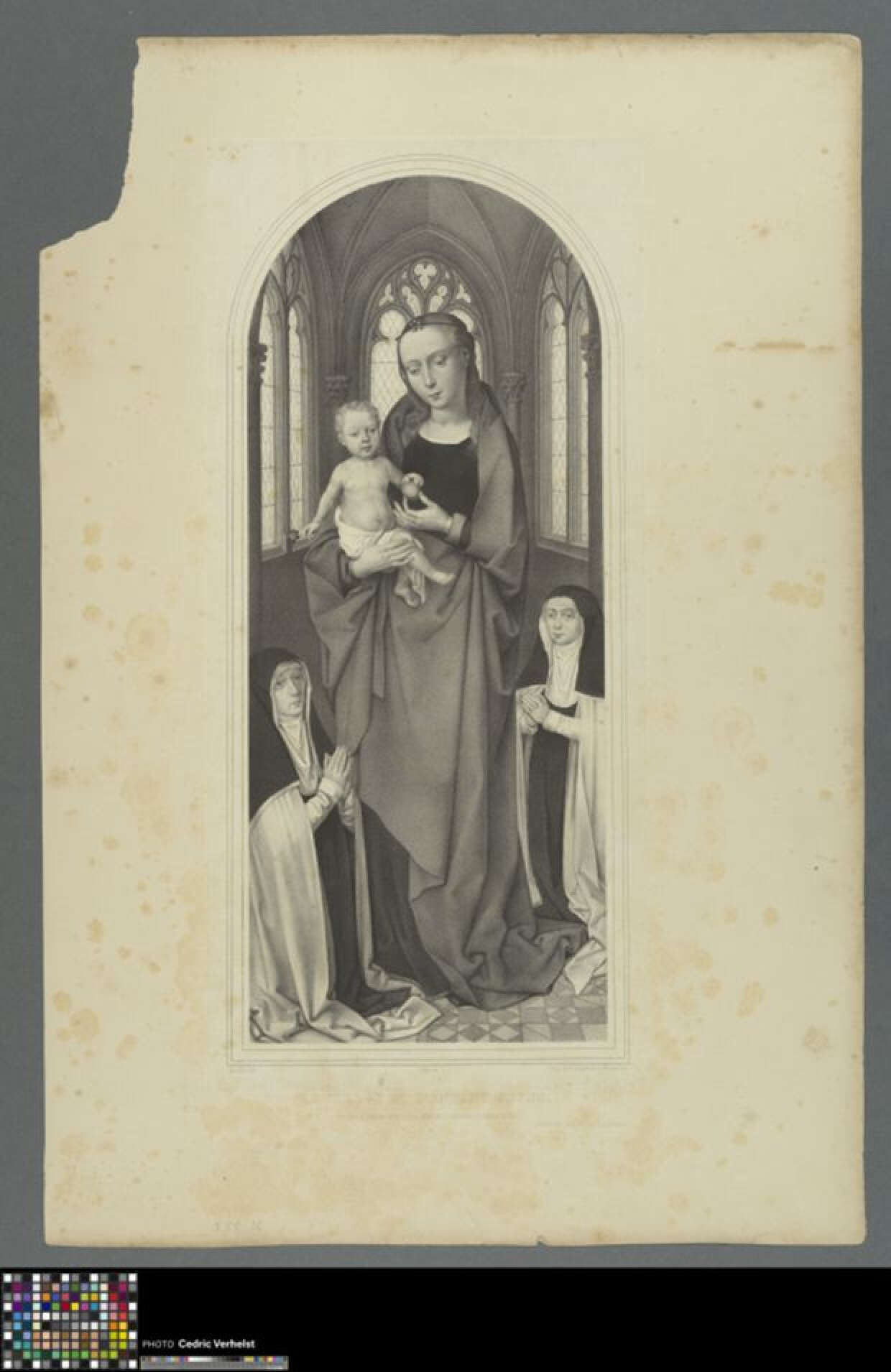 19de eeuwPrent naar het Ursulaschrijn van Hans Memling. Dit is de negende plaat uit het album: Châsse de sainte ursule par jean memling: Composé & lith. par Manche & Ghémar, Bruxelles J. Buffa & Bogaert-Dumortier [1841]. We zien Onze-Lieve-Vrouw met het kind Jezus geflankeerd door twee knielende kloosterzusters. Alle vijftien platen uit dit album, behalve de tweede plaat met een portret van Memling en de vijfde plaat met de voorstelling van ‘Arrivée de Ste Ursule à Rome' behoren tot de collectie. Er zijn ook zes tekstbladen aanwezig.