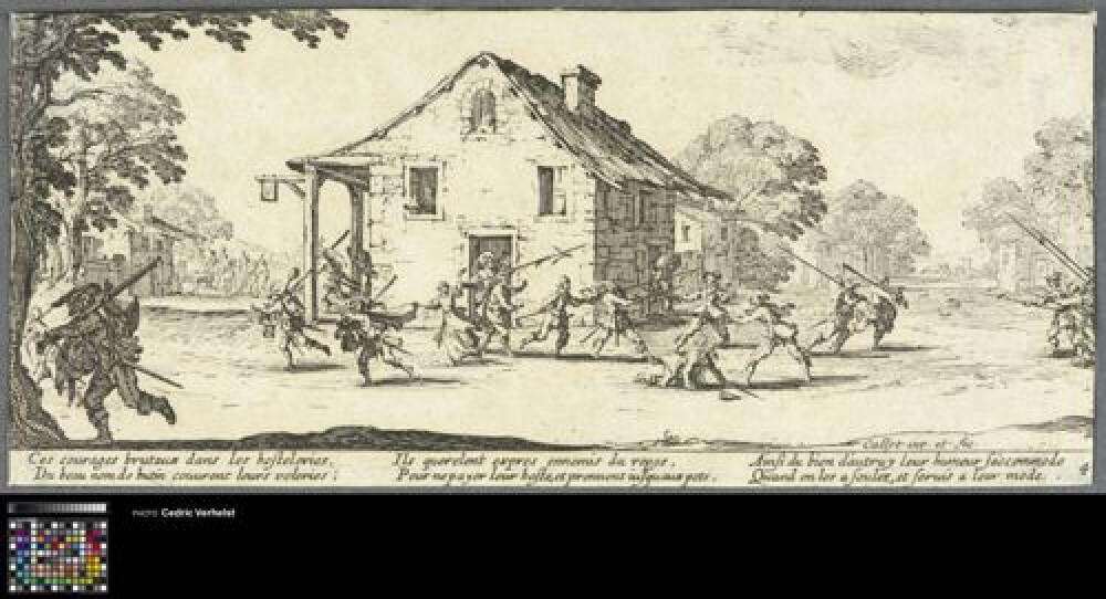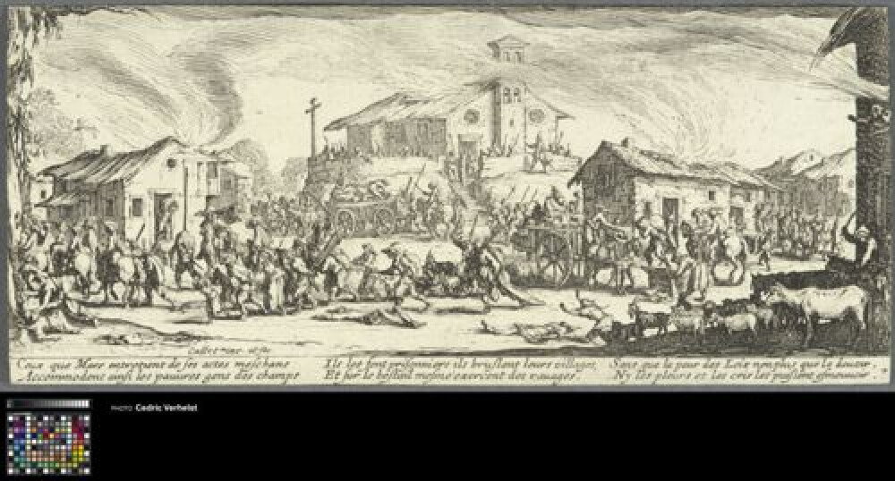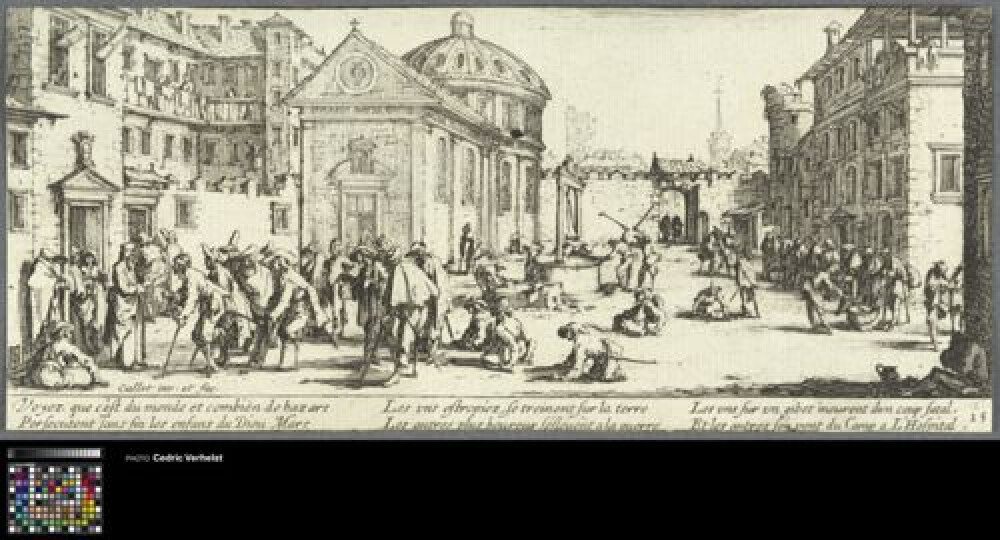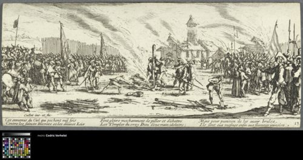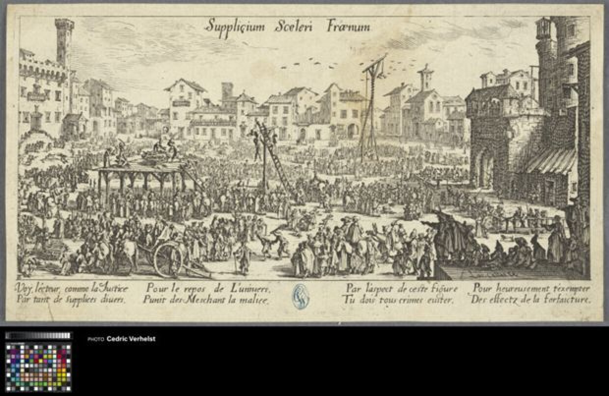 17de eeuwDe prent toont een groot, druk stadsplein waar grote aantallen toeschouwers verschillende lijfstraffen aanschouwen. In de linker benedenhoek is bijvoorbeeld iemand te zien die op een nog niet aangestoken brandstapel zijn lot staat af te wachten, met knielende mensen in een cirkel eromheen. Links in het midden is een hoog podium te afgebeeld waarop mensen verschillende gruwelijke straffen ondergaan, en ook zijn er nog twee hoge galgen afgebeeld. Rechts in de voorgrond staan toeschouwers vanaf een verhoging toe te kijken of het plein, waarbij ze staan te wijzen naar hetgeen er te zien is. In het midden bovenaan in de voorstelling staat de Latijnse titel van de prent gedrukt. Onder de voorstelling staan nog acht Franse versregels. Rechts onderaan, onder de toeschouwers, staat de signatuur van de maker.