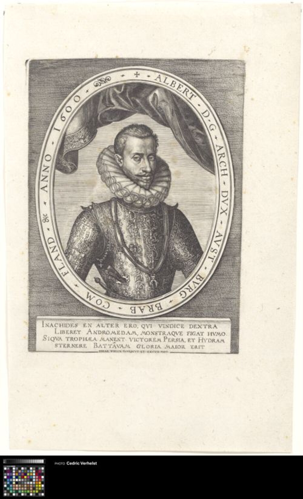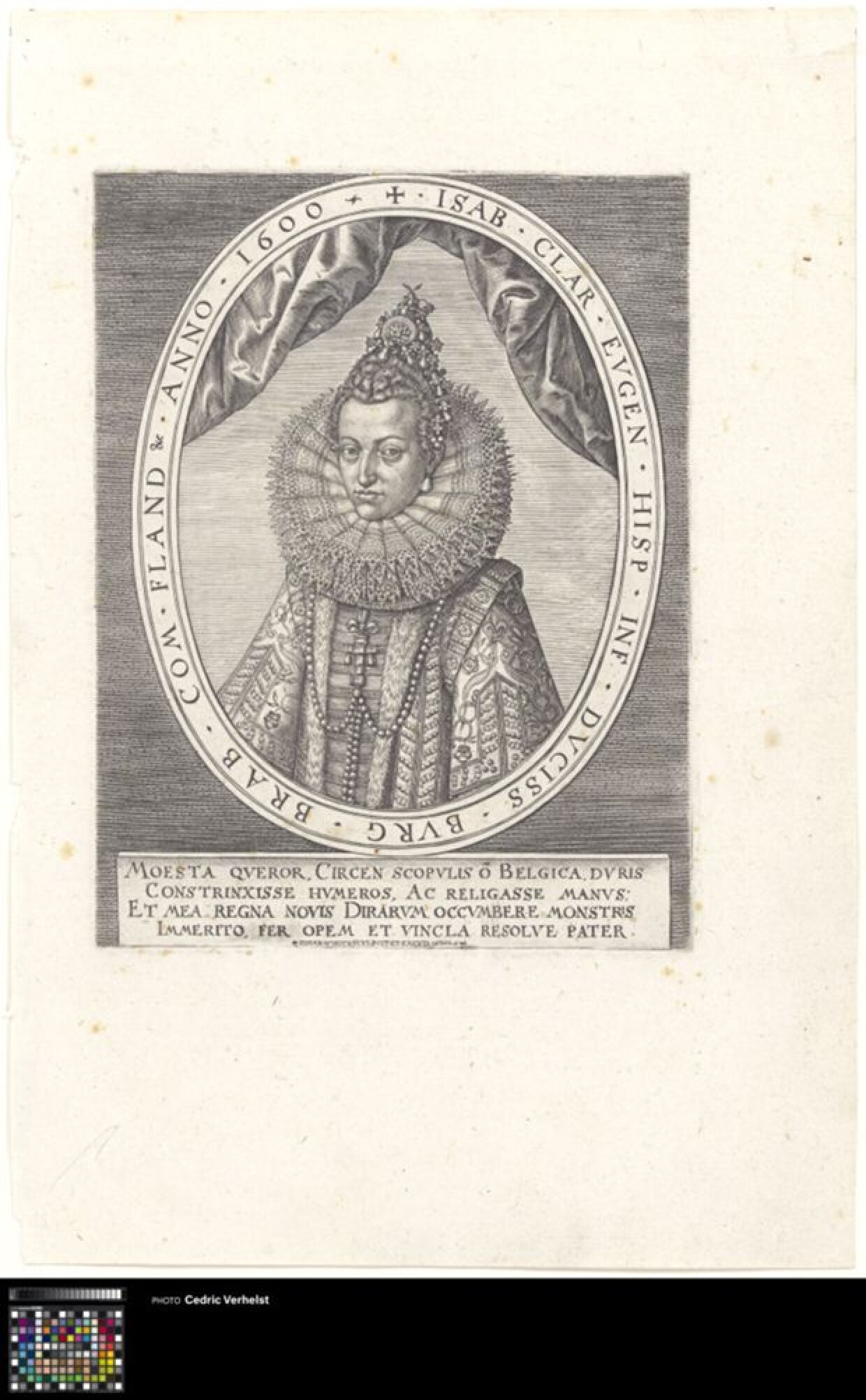 17de eeuwIsabella Clara Eugenia (1566 - 1633) was de dochter van Filips II van Spanje en de echtgenote van Albrecht van Oostenrijk. Na de dood van haar echtgenoot in 1622 werd zij landvoogdes over de Zuidelijke Nederlanden, tot aan haar dood in 1633. Isabella is hier ten halve lijve naar links afgebeeld, binnen een ovalen kader op een rechthoekige verhoging. Zij is zeer rijkelijk gekleed in een jurk met veel decoratieve elementen, vele sieraden en parels en een grote kanten kraag. Haar haren zijn opgestoken en met sierraden en edelstenen versierd. Zij kijkt de toeschouwer recht aan. Boven haar hoofd zijn gordijnen gedrapeerd. De inscriptie in het ovalen kader rond het portret vermeld haar naam en haar functies. Onder het portret, binnen een rechthoekig kader, zijn vier regels Latijnse tekst gedrukt.