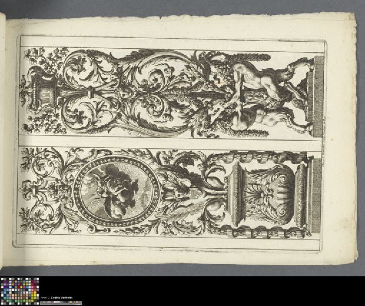 17de eeuwVijfde prent van een reeks. Ze bestaat uit twee verticale composities, van elkaar gescheiden door witruimte. in de linkse strook zit een sfinx op een sokkel. In het medaillon erboven is een vrouw afgebeeld, vastgehouden door een man met vleugels, zwevend op een wolk in de lucht. Het geheel wordt bij elkaar gehouden met planten en guirlandes. Rechts ondersteunen twee faunen een ranke zuil met grote bladeren en bloemenguirlandes.