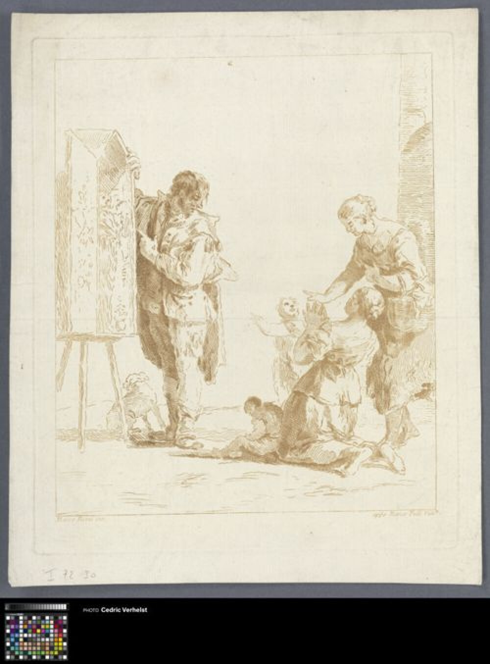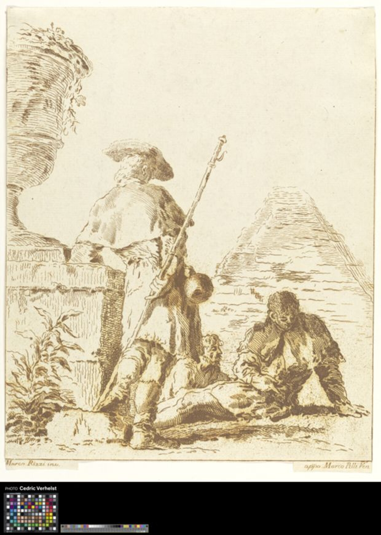 18de eeuwVooraan steunt een man met zijn linkerarm op het voetstuk van een grote vaas. Twee andere mannen zitten of liggen op de grond. Achteraan staat een piramide met missende punt. Rand geknipt en opschrift onderaan terug aan geplakt.