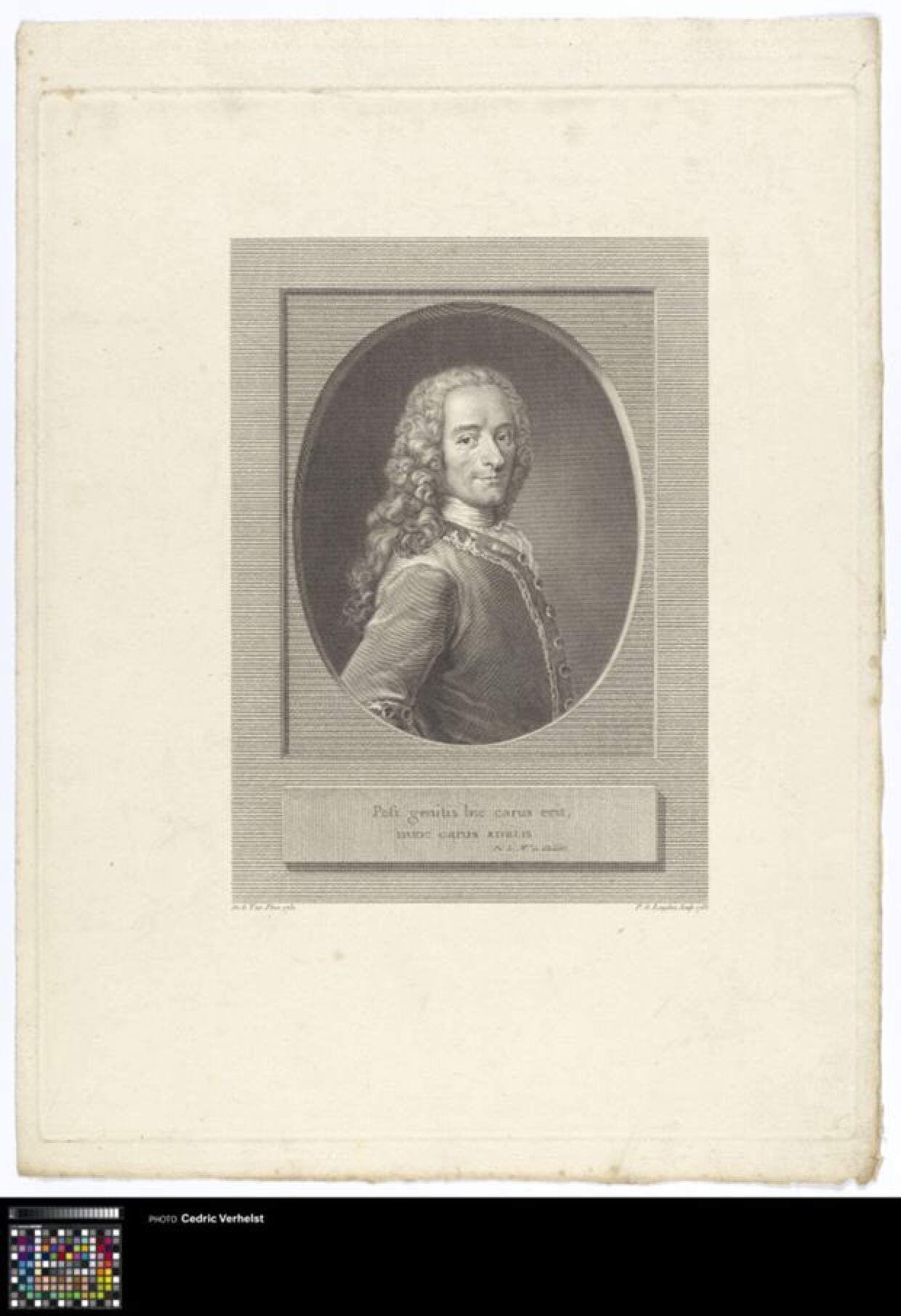18de eeuwPortret van de Franse schrijver Voltaire (1694-1778), ten halve lijve naar rechts, met het gezicht naar de toeschouwer gedraaid. Voltaire, pseudoniem van François Marie Arouet, draagt een lange krullende pruik, een jasje met knopen op de borst, en een witte kraag. Hij houdt zijn rechterarm iets omhoog. Het portret is gevat in het ovalen kader van een trompe l'oeil passe-partout. Onder het portret is een rechthoekig kader weergegeven waarop een inscriptie in het Latijn staat.
