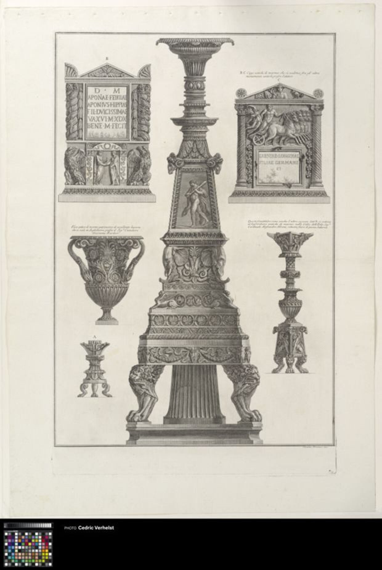 18de eeuwDeze prent behoort tot de reeks 'Vasi, candelabri, cippi, sarcofagi, tripodi, lucerne, ed ornamenti antichi disegnati ed incisi dal Cav. Gio. Batt. Piranesi'. Het gaat om een druk die de eerste genummerde uitgave van deze prentenreeks in 1778 voorafgaat.