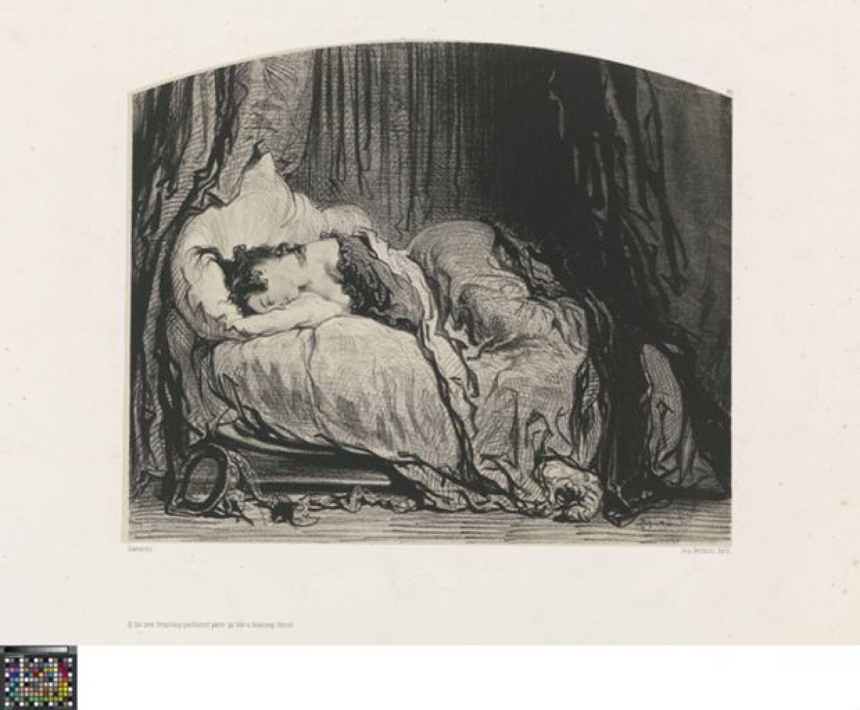 Een jonge vrouw ligt te slapen in een bed. Deze prent verscheen als plaat 44 in vol. 2 van de reeks 'Les artistes anciens et modernes' (1848-1862).