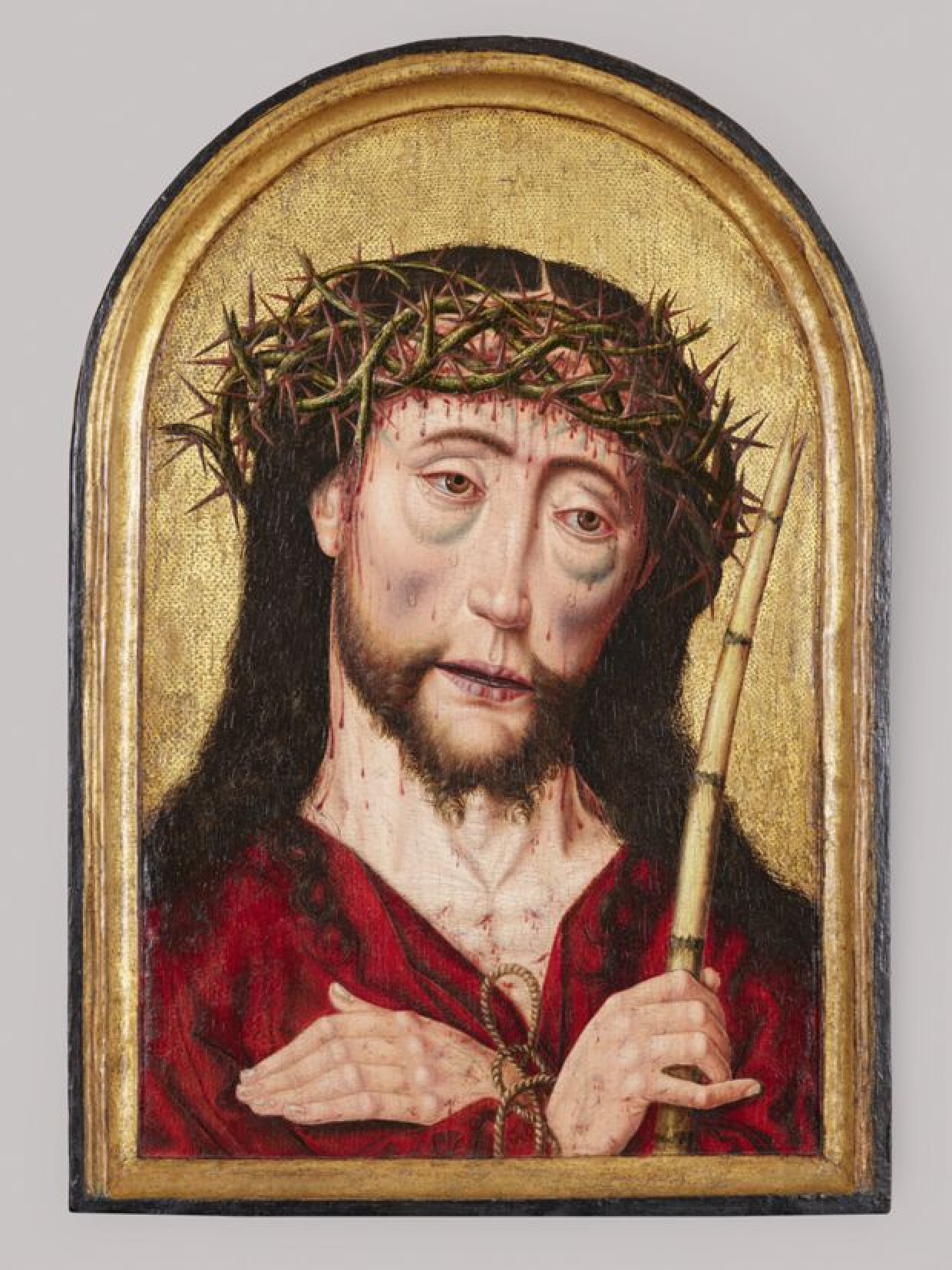 16de eeuwHet schilderij toont een portret van Christus met doornenkroon tegen een gouden achtergrond. Christus is afgebeeld met gebonden polsen en in de rechterhand een rietstengel, het symbool voor de vernedering die hij ondergaat. De rode mantel symboliseert zijn lijdensweg. Het hoofd lichtjes gebogen, de ogen vol droefenis, en met geopende mond, draagt Christus met waardigheid zijn pijnlijke beproeving. Het schilderij is bovenaan halfrond van vorm, een gebruikelijk formaat dat geschikt was voor private devotie. Olieverf op paneel, met originele gepolychromeerde lijst bewaard in een houten structuur in de vorm van een triptiek (20ste eeuw).
