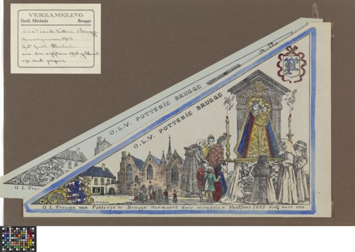 20ste eeuwTwee bedevaartvaantjes van papier, rechthoekige driehoek van rechts naar links. Bruin tekenpapier met daarop twee vaantjes bevestigd, achterste vaantje gedrukt op groen papier,voorste vaantje op beige-groen papier en deels ingekleurd. Deze laatste behoort tot 1 van de 15 ingekleurde exemplaren op oud papier. Zwart-wit druk. Zinkgravure. Rechts staat een verhoogde nis met daarop Maria en kindje Jezus op de linkerarm. Rond de nis staan een aantal vrouwen, kloosterzusters en enkele kinderen (waaronder één met een vaantje in de hand en een plechtige communicante die een kaars draagt), die het Mariabeeld vereren. Op de achtergrond zijn de gebouwen van de Potterie zichtbaar, met enkele bedevaarders ervoor. Linksonderaan prijkt het Brugse stadswapen. Daarnaast staat de naam van de kunstenaar 'Guill. Michiels' die de tekening maakte. Langs de schuine zijde staat 'O.L.V. Potterie Brugge'. Rechtsboven staat het embleem van de Potterie. Onder het vaantje staat de tekst 'O L Vrouwe van Potterye te Brugge Vermaert door mirakelen Van't Jaer 1009 bidt voor ons'.
