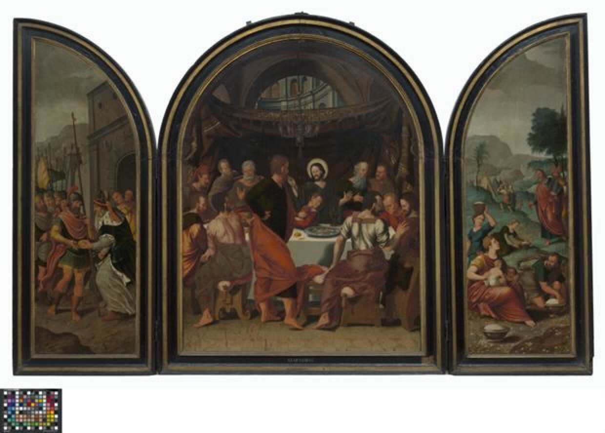 17de eeuwOp het middenluik wordt Jezus voorgesteld, met aureool. Hij zit centraal aan een gedekte tafel en wordt omringd door zijn apostelen. Hij stelt het Heilig Sacrament in. Op het linkerluik wordt de ontmoeting tussen Abraham en Melchisedeh voorgesteld. De aartsvader Abraham is uitgebeeld als een krijgsheer in een harnas, Melchisedech draagt een lang gewaad en biedt hem brood en wijn in een kruik aan. Op het rechterluik wordt de Mannaregen uitgebeeld, het voedsel dat God schonk aan het volk van Israël toen het door Mozes door de woestijn werd geleid. Mensen verzamelen het manna in aarden potten. Op de buitenluiken wordt de Annunciatie voorgesteld: links de engel, rechts Maria. Olieverf op paneel.