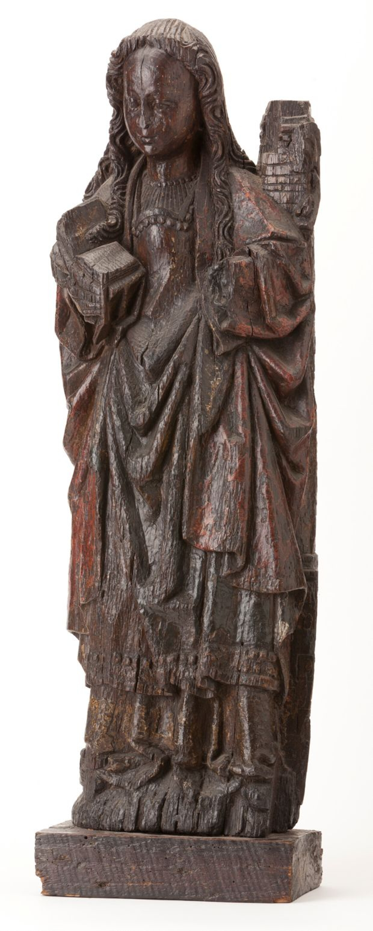 16de eeuwDe heilige Barbara is herkenbaar aan haar attribuut, de toren aan haar linkerzijde. Deze Barbara werd in Leuven gemaakt en is vermoedelijk een fragment van een groot retabel. Ze behoort tot hetzelfde Leuvense atelier als de Madonna met kind, de heilige Catherina van Alexandrië, Antonius-Eremiet, Petrus, Hubertus en Servatius en vertoont grote gelijkenissen met de Sint-Anna ten drieën uit de Sint-Jacobskerk te Leuven.
