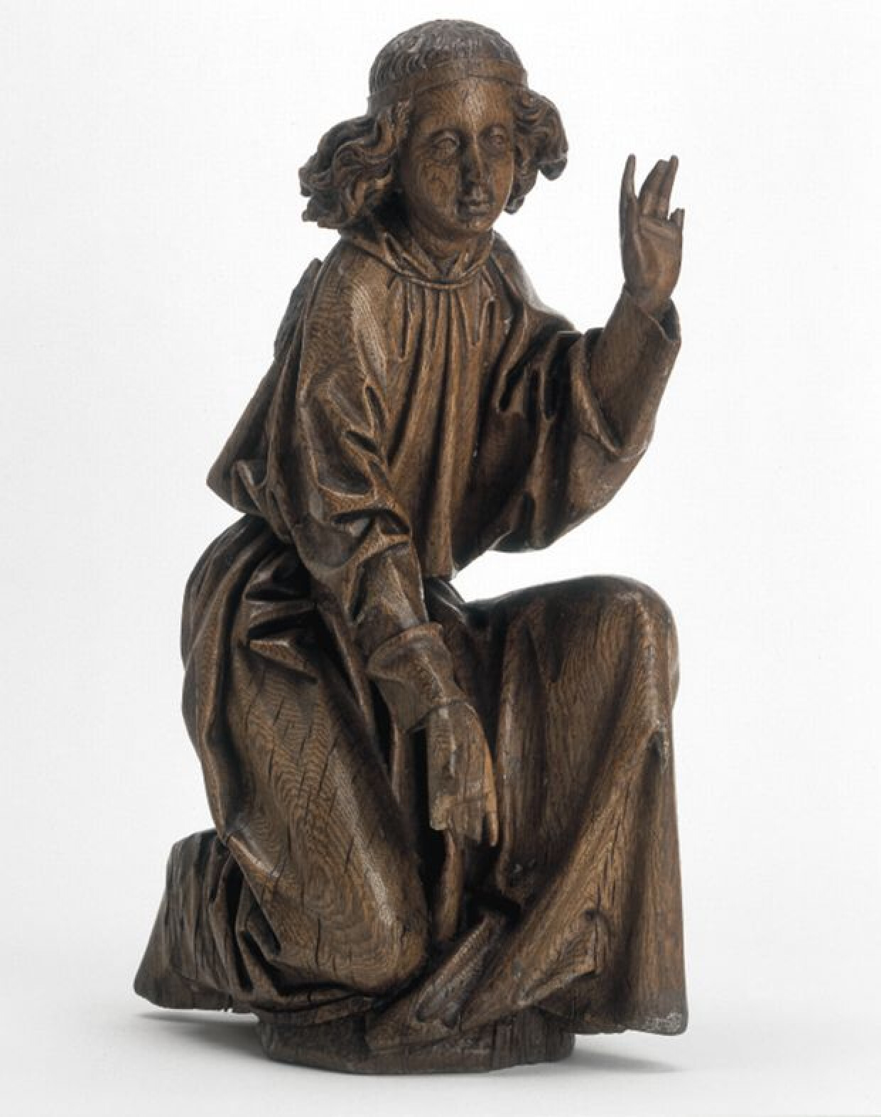 Deze knielende engelenfiguur van eikenhout vertoont grote stillistische overeenkomst met een andere knielende engel uit de Gruuthusecollectie (V.1999.0046). Beide sculpturen dragen een gedrapeerd kleed dat met behulp van een koord om het middel is vastgemaakt. De hoofden hebben een serene en lieftallige blik. Het welig krullende haar wordt bedwongen met een band rond het hoofd. Beide engelen hebben gelijklopende afmetingen. Het is plausibel dat beide figuren deel zijn van eenzelfde retabel. Algemeen wordt aanvaard dat deze 2 beelden deel zijn van hetzelfde retabel en dat ze tevens ook in Brugge zijn vervaardigd. Vroeger werd o.a. door Konrad in 1928 nog aan Brussel gedacht als vervaardigingsplaats.