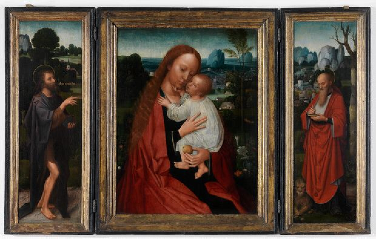 16de eeuwDe houding van het liefkozend kind in de armen van zijn moeder, is duidelijk overgenomen van de zeer populaire en door kopieën (o.m. van de hand van Petrus Christus) alom verspreide 'Notre -Dame de Cambrai', een Italo-Byzantijnse ikoon, die rond het midden van de 15de eeuw uit Rome was meegebracht en aan de kathedraal van Cambrai werd geschonken. De buitenzijde van de luiken vertoont twee wapenschilden op een rode fond in natuursteenimitatie. Het linker wapenschild is dat van de Brugse familie Pardo, het rechter is nog niet geïdentificeerd.