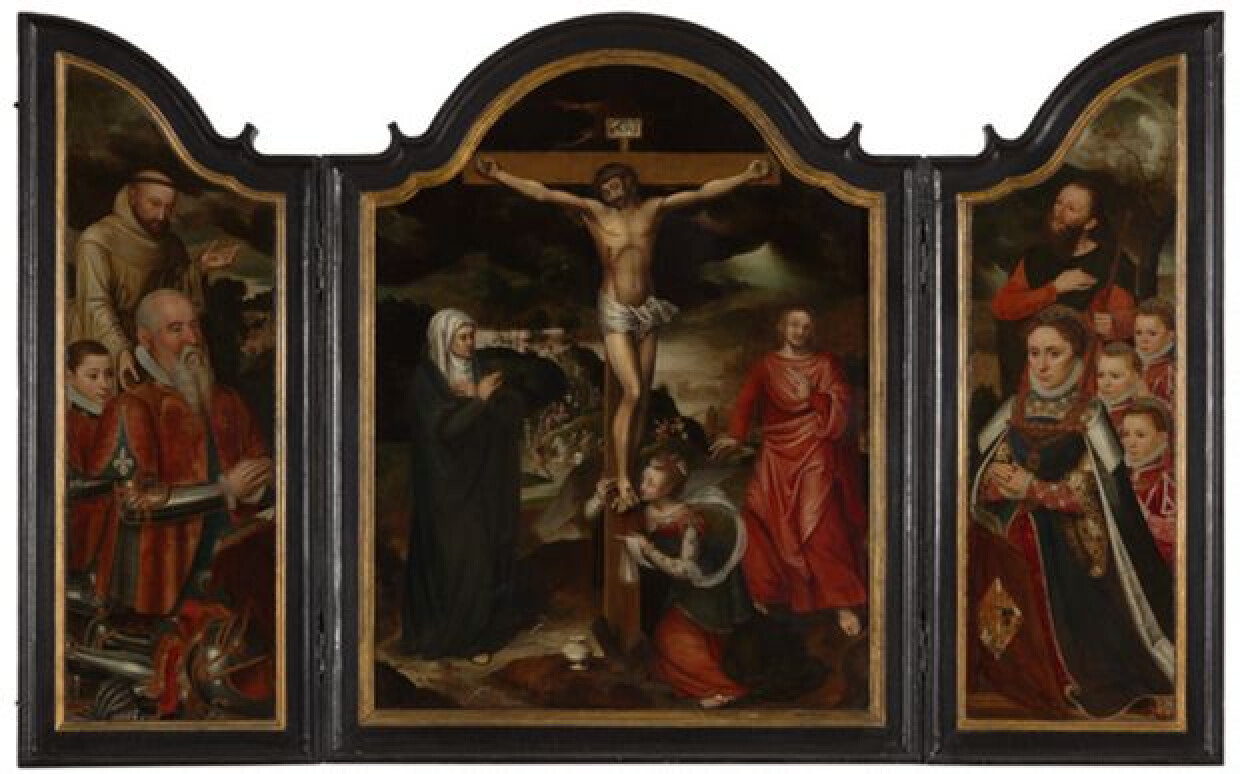 Pieter Claeissens I is de vader van de Brugse kunstenaars Pieter Claeissens II en Antoon Claeissens. Hoewel van zijn zonen veel werk bekend is, is dit voor hem niet het geval. Dit middenpaneel kan met enige zekerheid aan de vader worden toegeschreven. Zo komen de elementen in de compositie, de vorm en de afmetingen van het middenpaneel overeen met twee luiken die nu in het museum van het O-L-V ter Potterieklooster worden bewaard. Deze luiken worden op stilistisch gronden aan de Claeissens-familie toegeschreven en moeten al rond 1567 zijn ontstaan. Op dat moment waren Pieter II en Antoon nog geen vrijmeesters. Daardoor is het zeer waarschijnlijk dat deze kruisiging onder leiding van Pieter Claeissens I werd vervaardigd.