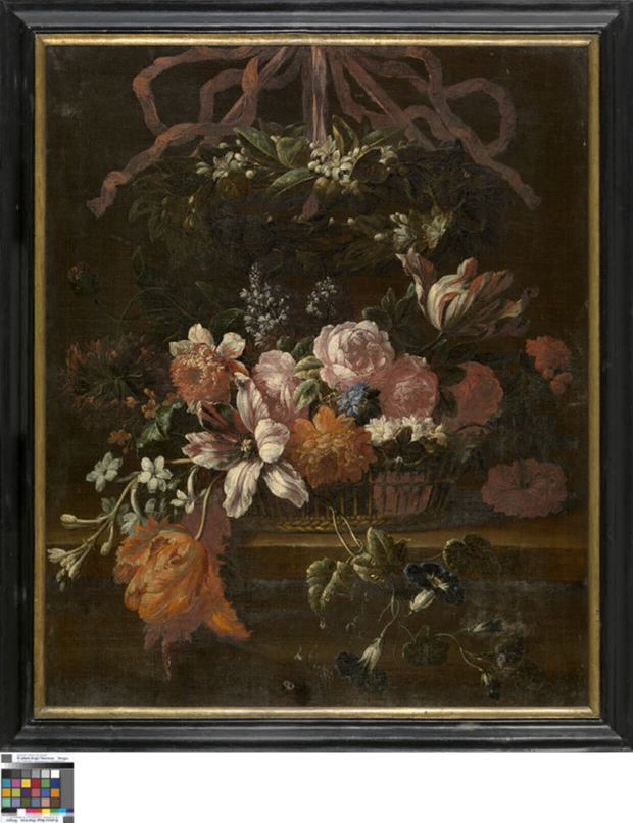 18de eeuw 17de eeuwEen rijk gevarieerd boeket in een rieten mand. Erboven een aan linten opgehangen krans van bloemen en bladeren. Dit werk heeft een pendant, het Bloemstuk 0000.GRO1495.I. Beide werken zijn links onderaan gesigneerd. (Naar: H. Vlieghe, Stedelijke Musea Brugge. Catalogus Schilderijen 17de en 18de eeuw, Brugge, 1994, p. 218.)