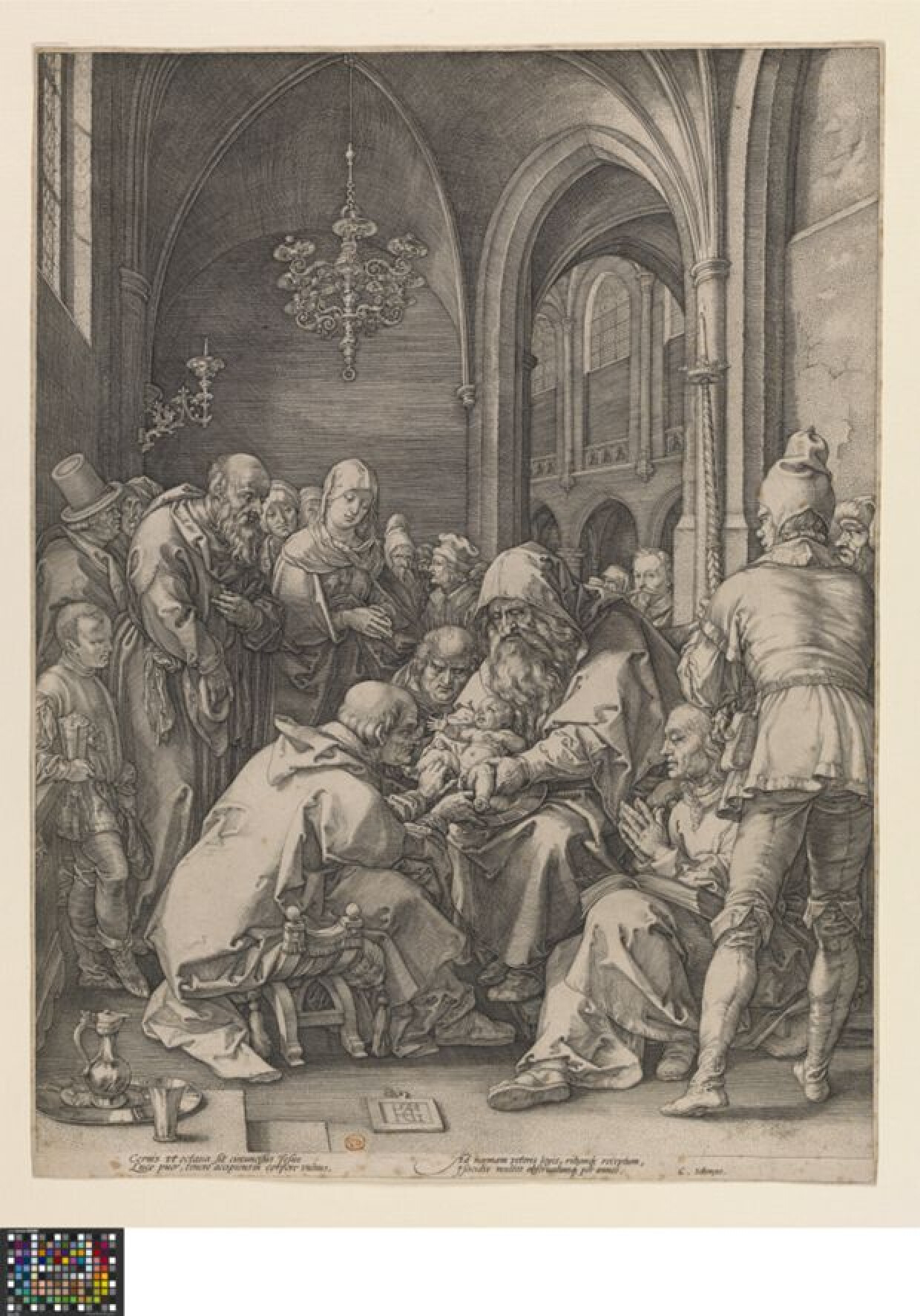 In een kapel van een kerk met gotische stijlkenmerken heeft een priester het Christuskind op schoot. Jezus wordt boven een schaal besneden door een chirurgijn die tegenover de priester zit. Omstanders lezen religieuze teksten en bidden. Een figuur die rechts in de voorstelling van op de rug te zien is, houdt een kaars vast. Links van de priester staan Maria en Jozef. Achter hen staat een grote menigte geïnteresseerden. Bij de ingang van de kapel heeft Goltzius zichzelf als een van de omstanders afgebeeld. Hij kijkt de beschouwer aan. Door de ingang van de kapel is het schip van de kerk te zien. Op de voorgrond staat een kan op een schaal en rechts daarvan staat een beker. Op een plakkaat die midden onderin op de grond ligt staan het jaartal 1594 en het monogram HG vermeld. In de marge onderaan is een vierregelig vers in Latijn gedrukt. De prent is gemaakt door Hendrick Goltzius en maakt deel uit van de reeks Meisterstiche of Het leven van de Maagd Maria (NH 11 I).