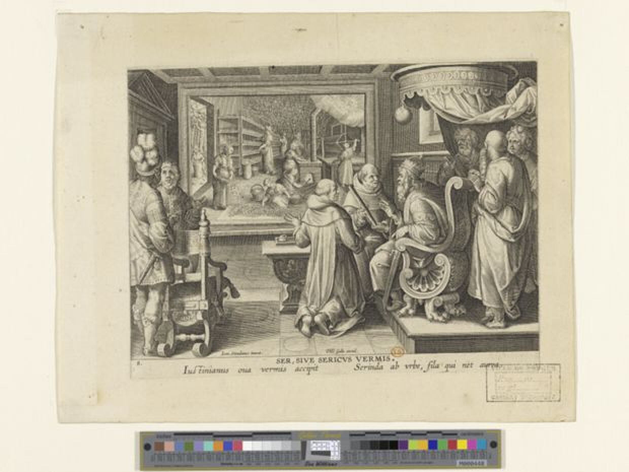 16de eeuwDeze prent toont de productie van zijde als nieuwe uitvinding van de vroegmoderne tijd. Het is de achtste prent in een reeks van negentien excl. titelprent (New Hollstein, Johannes Stradanus, part III, 322-341, 330.I).