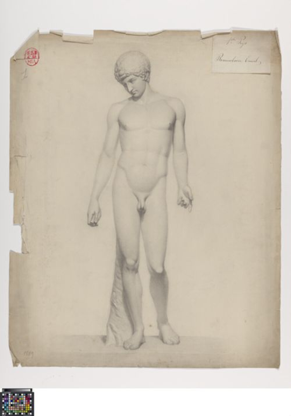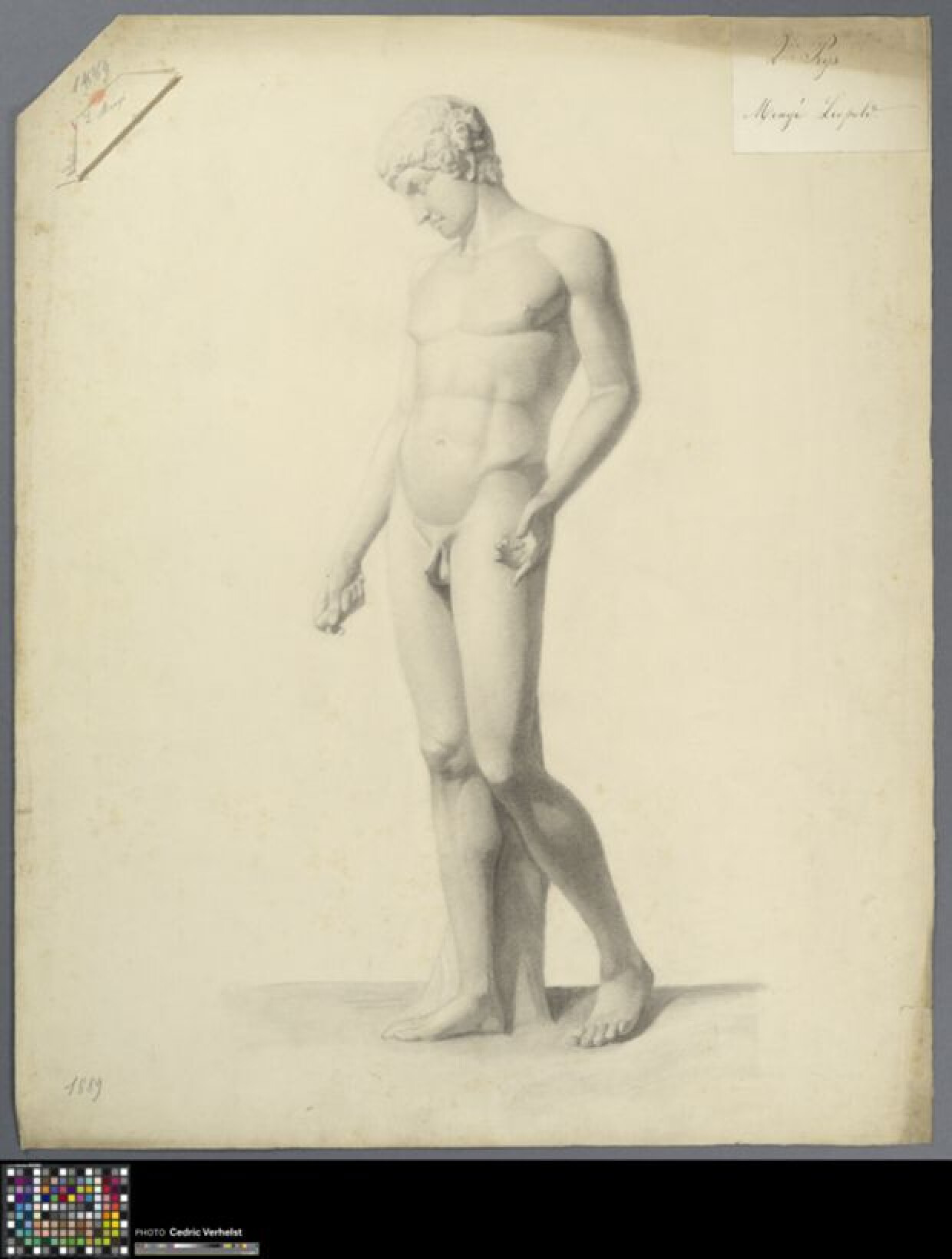 19de eeuwAcademische studie naar sculptuur van Antinoüs, getekend door Leopold Mengé in 1889. Mengé studeerde aan de Academie Brugge en maakte deze studie tijdens een wedstrijd. Hij won de eerste prijs in de categorie 'Antiek - beeld'. Voor deze wedstrijd tekende de leerling een afgietsel van de zgn. Capitolijnse Antinoüs (Musei Capitolini, Rome). De sculptuur is vanuit driekwart aanzicht getekend met zwart krijt of houtskool als medium. Emile Rommelaere ontving de eerste prijs tijdens het concours: 0016.GRO0241.II.
