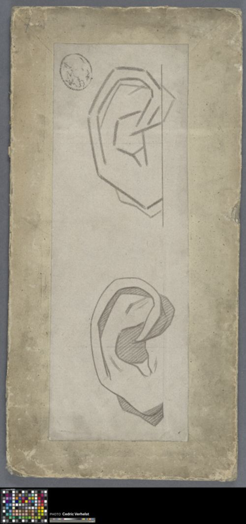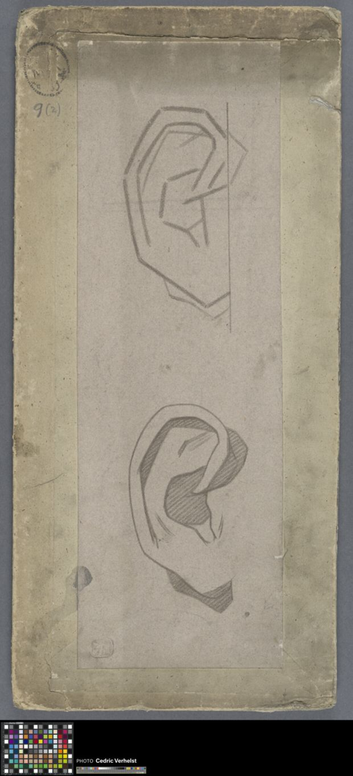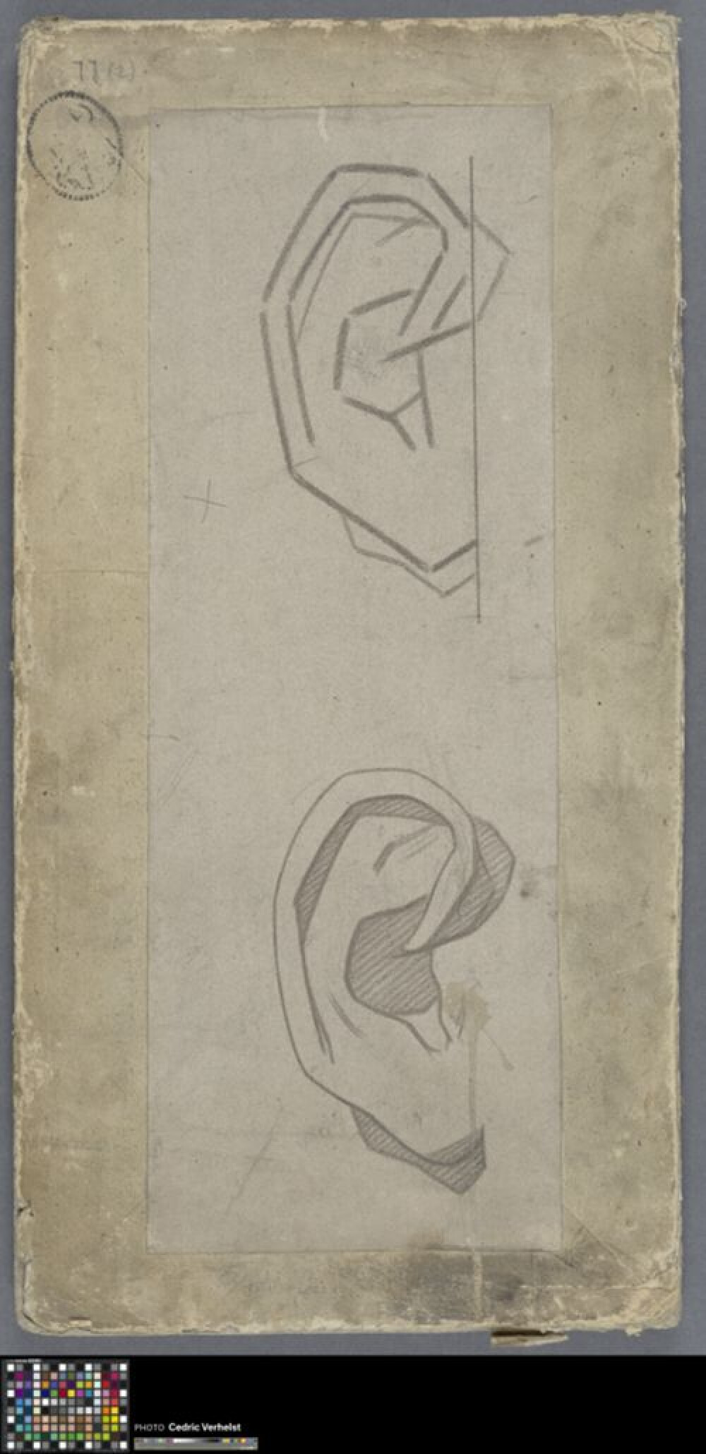 19de eeuwAcademische prent met een studie van oren, verlijmd op een steunkarton. De krijtlithografie komt uit de Cours de Dessin van Charles Bargue, uitgegeven bij Goupil en Compagnie in 1867. Het gaat om een fragment van Plaat 4 uit het eerste deel "Modèles d'après la Bosse". Er zijn twee oren afgebeeld op de prent: bovenaan een lijntekening met de hoekige basisvorm van het oor; daaronder een uitwerking in rondere lijnvoering met schaduwpartijen. In de Academie Brugge werden de krijtlitho's van Bargue als lesmateriaal gebruikt voor de beginnersklassen. De prent vormde oorspronkelijk een geheel met de andere helft van de prent met linkeroren (cf. 0022.GRO0822-824.III en 0022.GRO0828-829.III). Deze prenten zijn allemaal afgesneden en gemonteerd op karton.