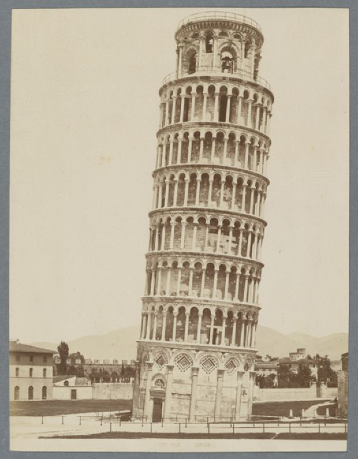 Deze fotografische afdruk beeldt de toren van Pisa (Italië) af in het Campo dei Miracoli. De scheve toren staat centraal. Op de achtergrond zijn huizen en een deel van de stadsmuur te zien, waarachter de heuvels zichtbaar zijn. Het opschrift komt overeen met de stijl van Giacomo Brogi, maar zijn droogstempel ontbreekt. Deze afdruk is deel van een reeks albuminedrukken van de Napolitaanse fotograaf Achille Mauri en andere 19de-eeuwse fotografen.