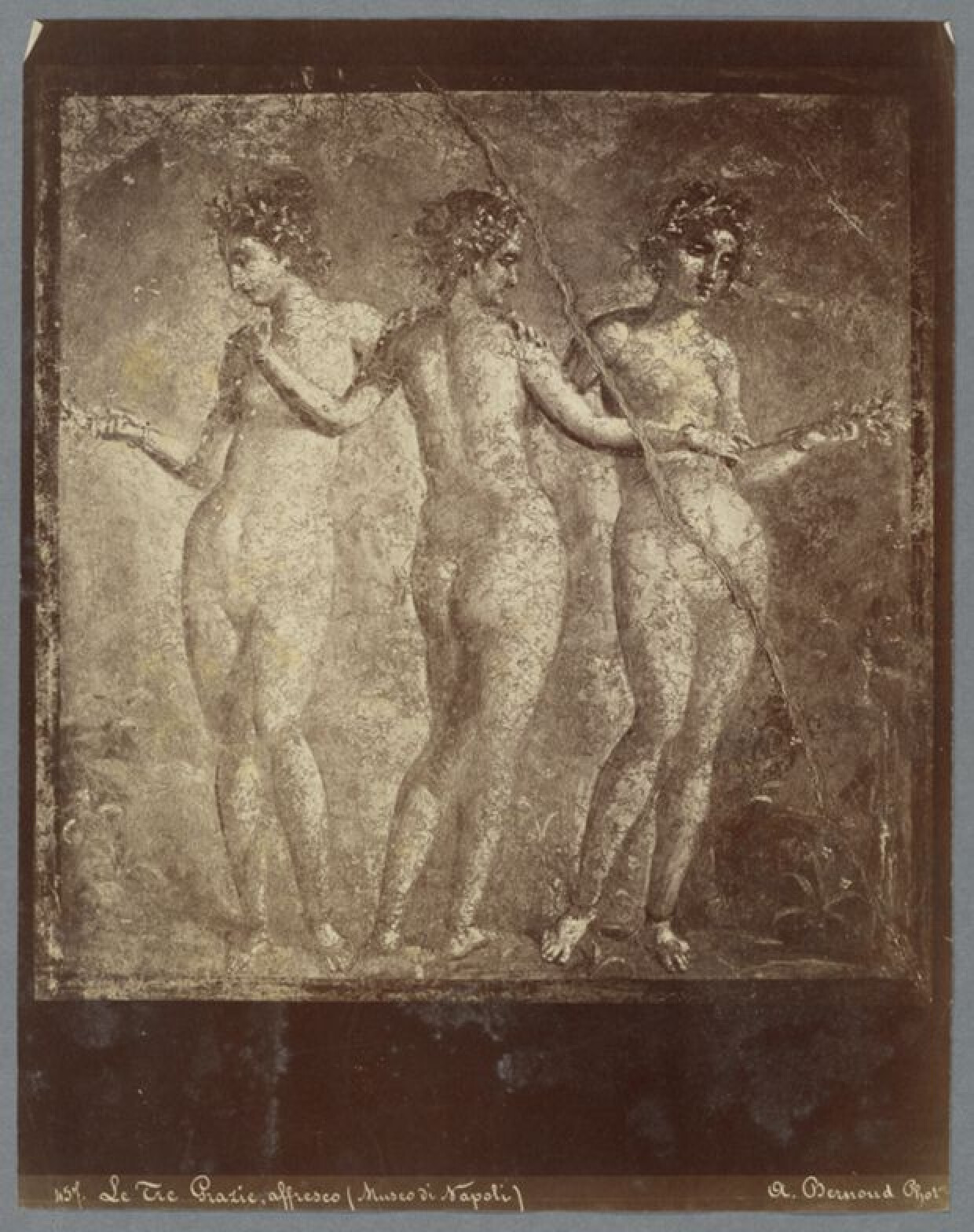 (1840 - 1870)Deze fotografische afdruk beeldt een fresco af van de drie Gratiën uit Pompeii. De foto werd genomen in het Nationaal Archeologische Museum van Napels. De fresco dateert uit het eerste eeuw v.C. Drie vrouwen staan naakt afgebeeld op een rij, waarbij die in het midden ons de rug toekeert. Ze zijn getooid met bloemenkransen en de twee buitenste vrouwen hebben bloemen in respectievelijk hun rechter en linkerhand. Hun andere handen plaatsen ze op de schouders van de vrouw in het midden. Zij plaatst haar linkerhand op de schouder van de vrouw links en haar rechter strekt ze uit naar de bloemen van de vrouw rechts. De drie Gratiën hebben verschillende namen in meerdere tradities van de oudheid, maar zijn doorgaans godinnen verbonden met schoonheid, vruchtbaarheid en natuur. De houding die ze aannemen in de fresco was een populaire manier om ze af te beelden in de Romeinse periode, die ook terugkwam in andere media, zoals sculptuur. Deze afdruk is deel van een reeks albuminedrukken van de Napolitaanse fotograaf Achille Mauri en andere 19de-eeuwse fotografen. Deze foto werd gemaakt door Alphonse Bernoud, wiens studio later werd overgenomen door Mauri. Let bijvoorbeeld op de gelijkenissen in lettering onderaan.