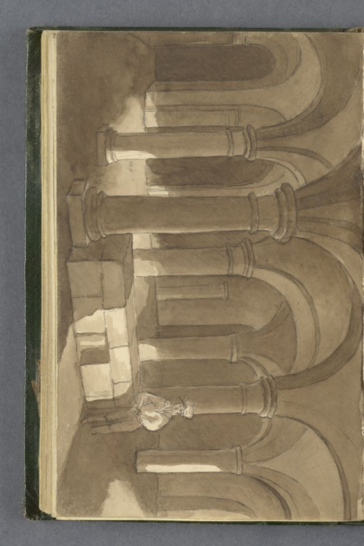 19de eeuwDe voorstelling toont de grafkelder van de Sint-Pieter-en-Sint-Guidokerk te Anderlecht. De vier centrale zuilen zijn vermoedelijk afkomstig uit een Romeinse villa. Op de zuilen rust een kruisribgewelf.
