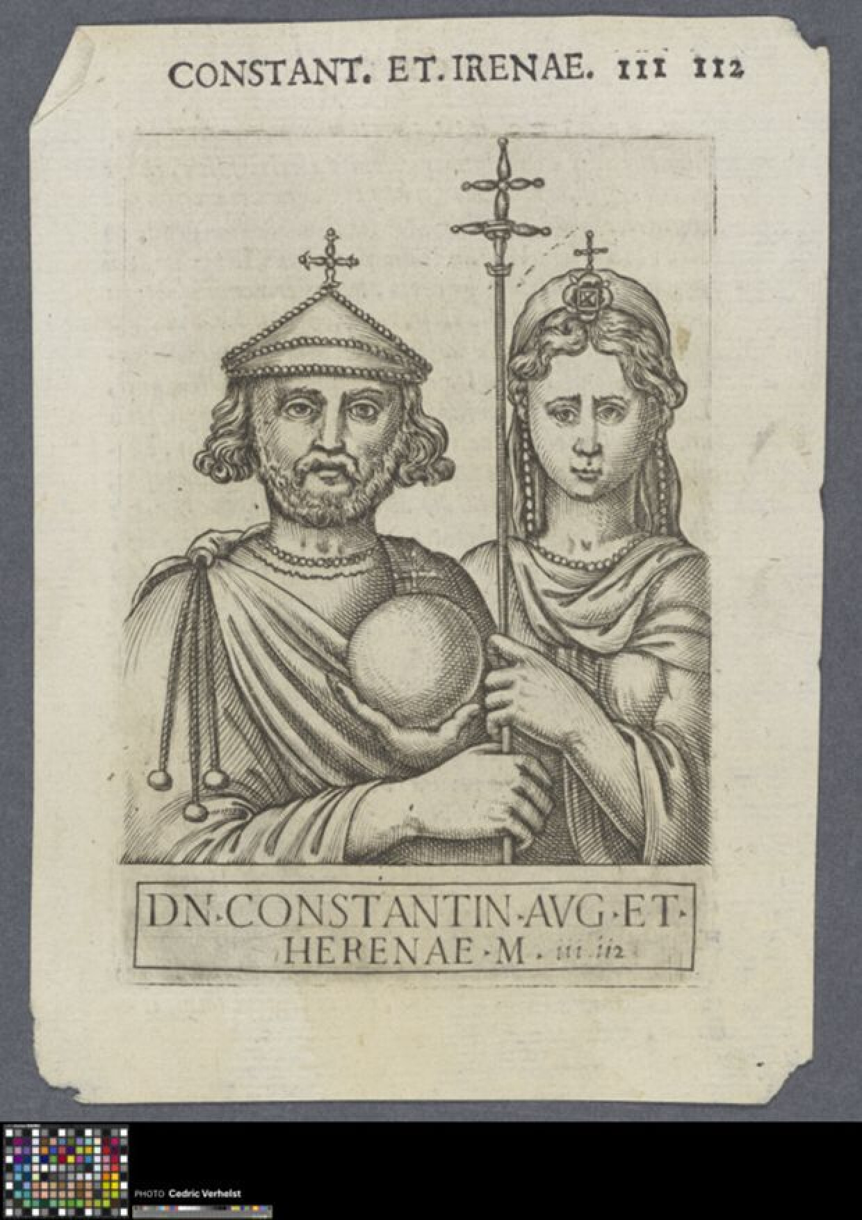 Dubbelportret van Constantijn VI (771-797) en zijn moeder Irene (752-803). De keizer wordt frontaal afgebeeld met een rijksappel in de linkerhand en een kroon met een kruisvormig sieraad. Samen met zijn moeder houdt hij een scepter vast. Irene draagt ook een kroon met een ingezet sieraad, getopt door een kruis. Constantijn VI werd in 776 op vijfjarige leeftijd medekeizer met zijn vader Leo IV, die hij in 780 opvolgde. Irene regeerde over het rijk als regentes. Zij zal een einde maken aan een periode van iconoclasme, opgelegd tijdens de heerschappij van haar man Leo IV. Tijdens het Tweede Concilie van Nicea in 787, bijeengeroepen door Irene, werd beslist om de beeldenverering terug in te voeren. Nadat ze haar zoon in gevangenschap liet verblinden nam ze de keizerskroon over. Ze regeerde als enige heerser van het Oost-Romeinse rijk van 797 tot 802. De gravure is een boekillustratie uit de publicatie "Romanorum Imperatorum effigies [...]" (1583/1592) met 157 portretten van keizers gegraveerd door Giovanni Battista de' Cavalieri en bijhorende lofteksten geschreven door Thomasz Treter. De tekst op de verso zijde verwijst naar het volgende portret. De prent maakt deel uit van een album met (losse) portretten uit de 16de en 17de eeuw (2014.GRO0019.III).