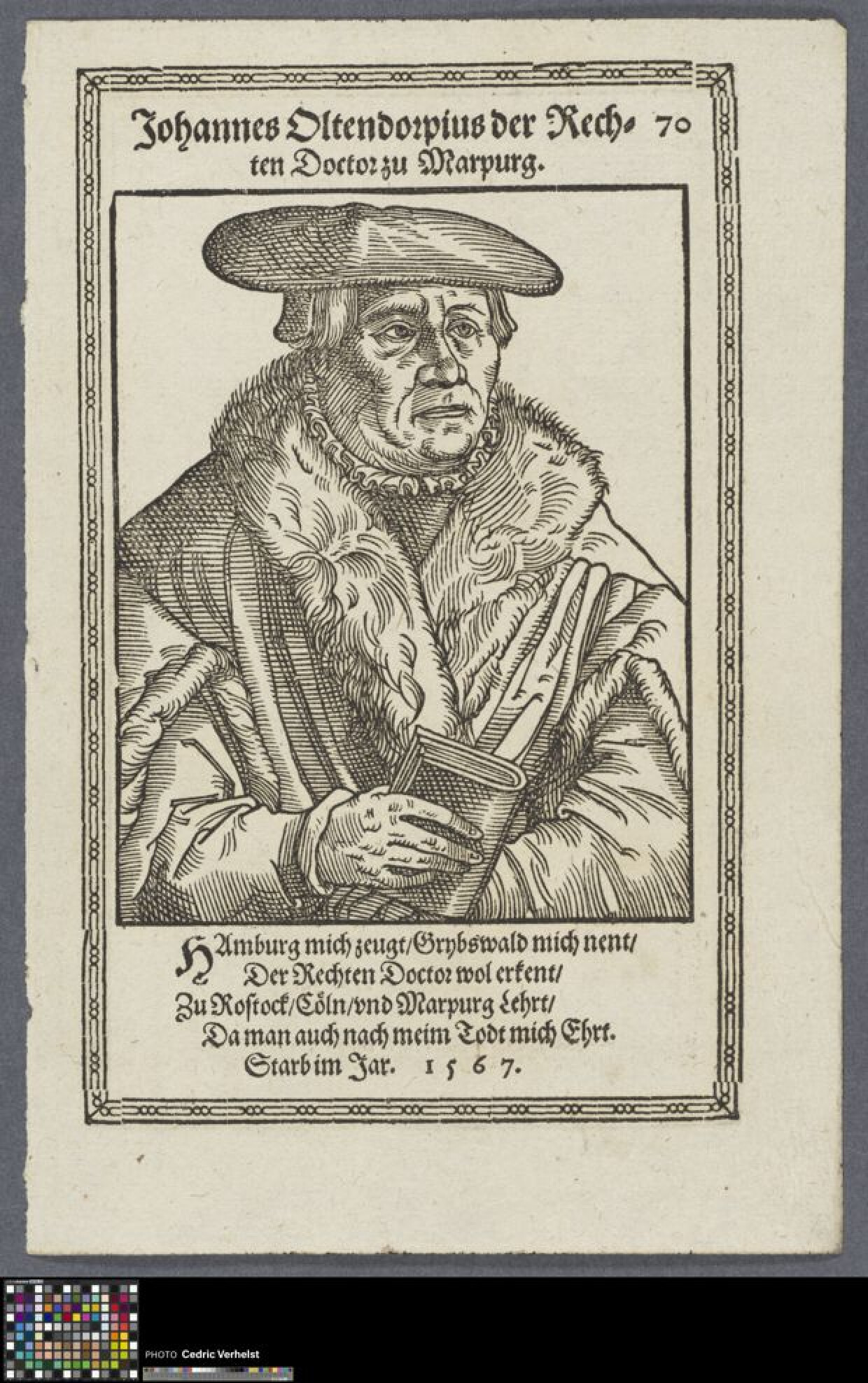 16de eeuwPortret van Johann Oldendorp (circa 1486 - 3 juni 1567), jurist, hervormer en professor in Marburg aan de eerste protestantse universiteit. Oldendorp wordt frontaal afgebeeld met het hoofd driekwart naar rechts. Hij draagt een baret en een mantel met bontkraag. In zijn rechterhand houdt hij een boek vast. Deze houtsnede is de 70ste illustratie uit het "Contrafacturbuch" van Nikolaus Reusner, uitgegeven bij Bernhard Jobin in 1587. Dit boek bevat 103 portretten van hervormers, protestanten, gereformeerden en humanisten. Elk portret is omkaderd door een rechthoekige lijst met parelmotief en voorzien van een begeleidend opschrift in boekdruk onder de voorstelling. Volgens het voorwoord zouden de beeltenissen teruggaan naar tekeningen van Tobias Stimmer, Johan Holbein en Christoph Maurer. De prent maakt deel uit van een album met (losse) portretten uit de 16de en 17de eeuw (2014.GRO0019.III).