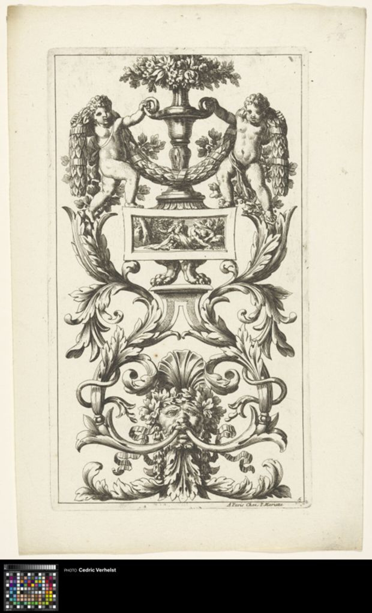 17de eeuwVijfde plaat van een publicatie over moderne ornamenten. De prent toont klassieke arabeske en groteske motieven. Onderaan komen florale motieven uit een hoofd. Bovenaan dragen twee putti een krans terwijl ze de oren van een vaas vasthouden.