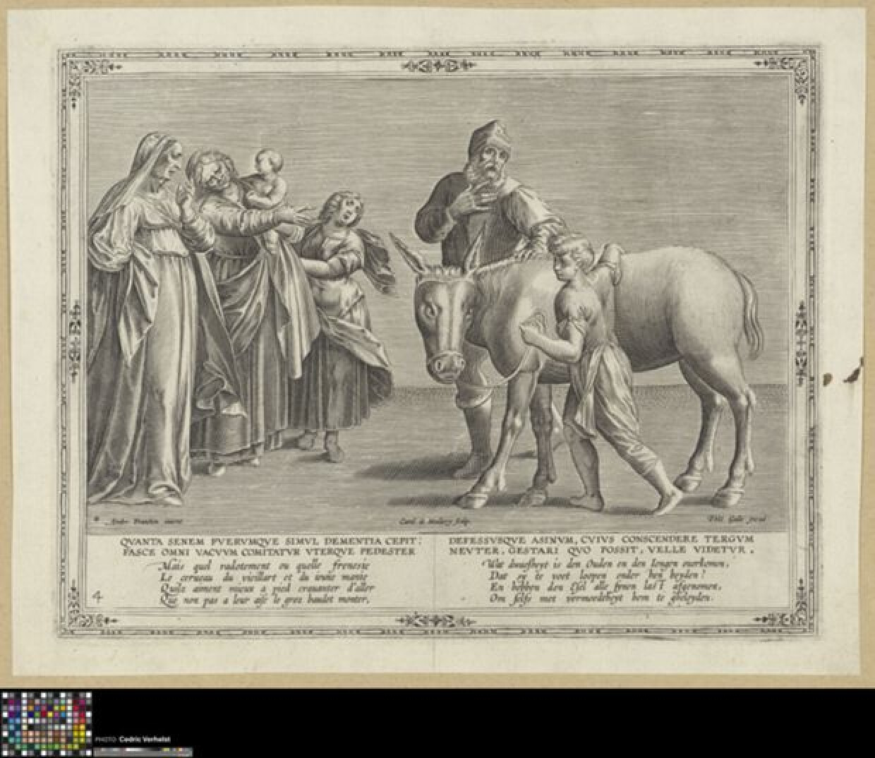 16de eeuw 17de eeuwDit is de derde prent van een reeks van zes gravures, gegraveerd door Karel de Mallery naar ontwerpen van Ambrosius Francken, en uitgegeven door Philips Galle. Vader en zoon wandelen naast de ezel. Omstanders lachen hen uit omdat ze geen gebruik maken van het dier.