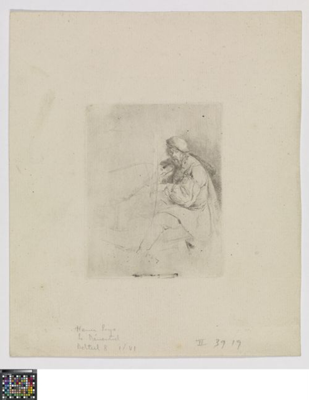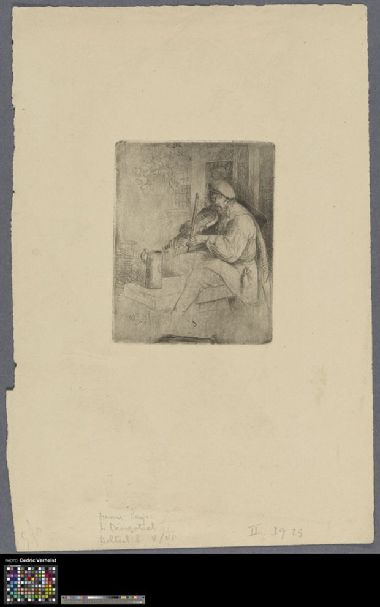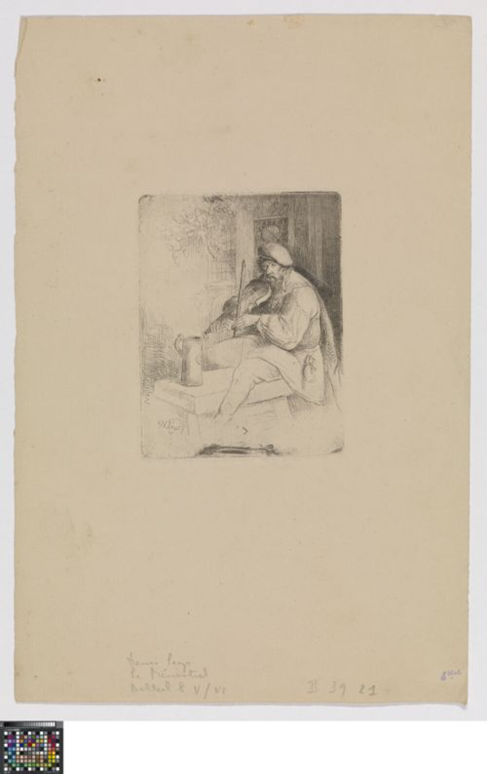 19de eeuwEen muzikant gezeten op een bankje speelt viool.