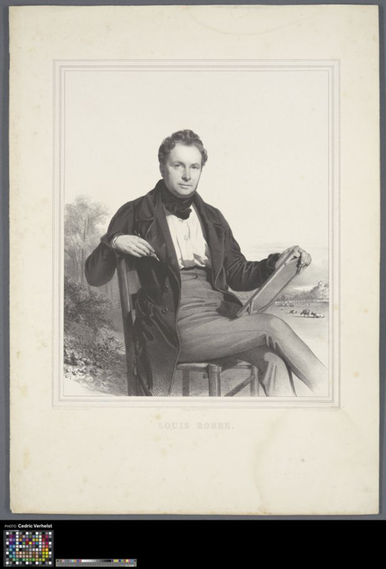 19de eeuwPortret van Louis Robbe (1806-1887), een Belgisch kunstenaar. De geportretteerde zit rechtop op een stoel met schrijfgereedschap in zijn rechterhand. In zijn linkerhand houdt Robbe een canvas vast dat rust op zijn dijbeen. Hij is buiten afgebeeld, aan de linkerkant bevinden zich enkele planten en bomen en rechts in de achtergrond lopen er tal van koeien. Andere print met dezelfde voorstelling: 2014.GRO0827.III