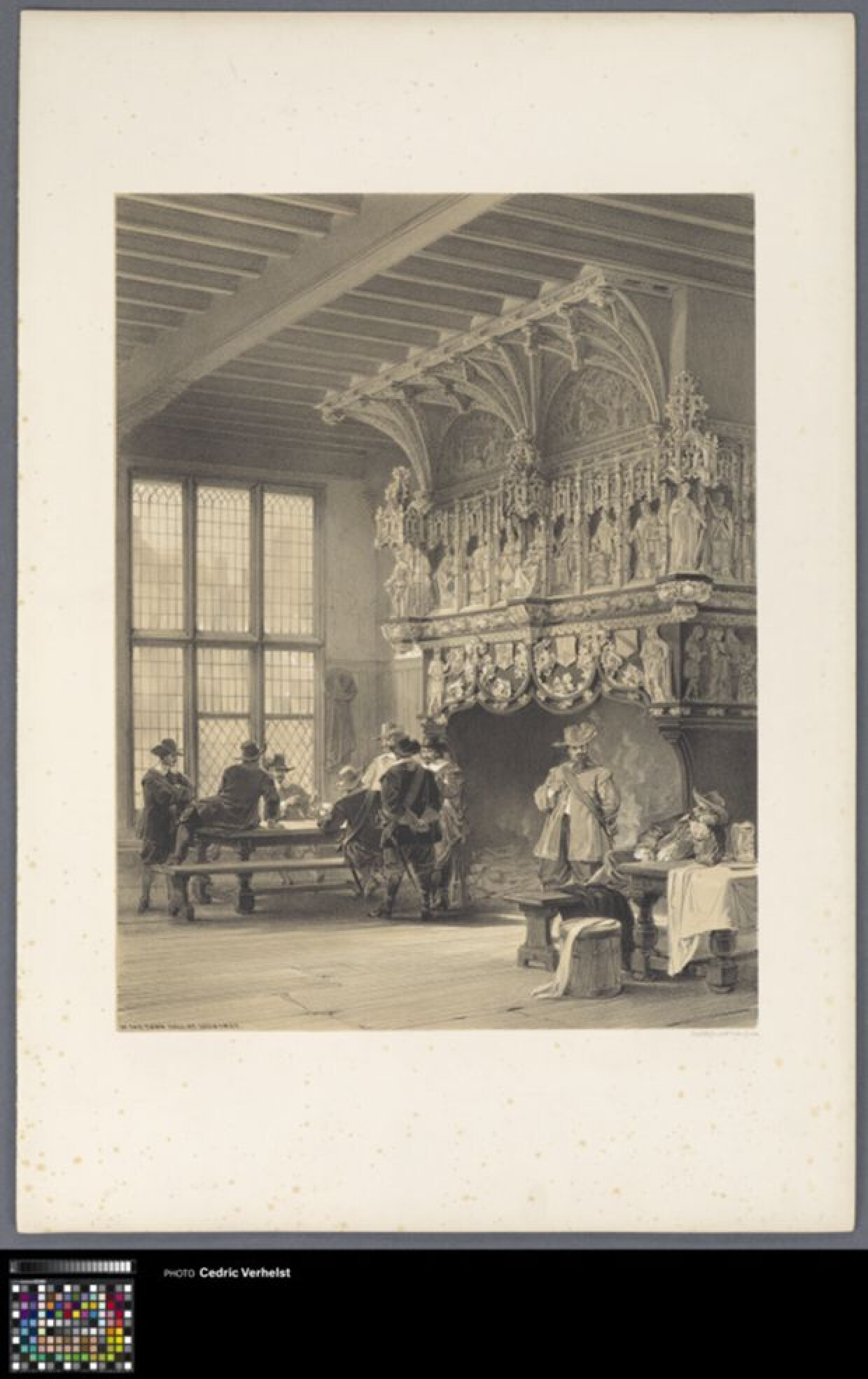 19de eeuwDeze prent toont de schepenzaal van het historische stadhuis van Kortrijk. De zaal bevindt zich op het gelijkvloers en heeft een natuurstenen schoorsteenmantel, gemaakt in 1527. Die vult de rechterkant van de voorstelling. De bovenkant is gemaakt van hout. Het grootste deel van de mantel is gewijd aan Christelijke iconografie. Centraal zit de Maagd Maria met Kind. De wereldlijke koning en koningin van Spanje zijn ook afgebeeld, samen met tal van wapenschilden. Er zijn negen mannen aanwezig in de zaal, zij zitten of staan aan twee tafels.