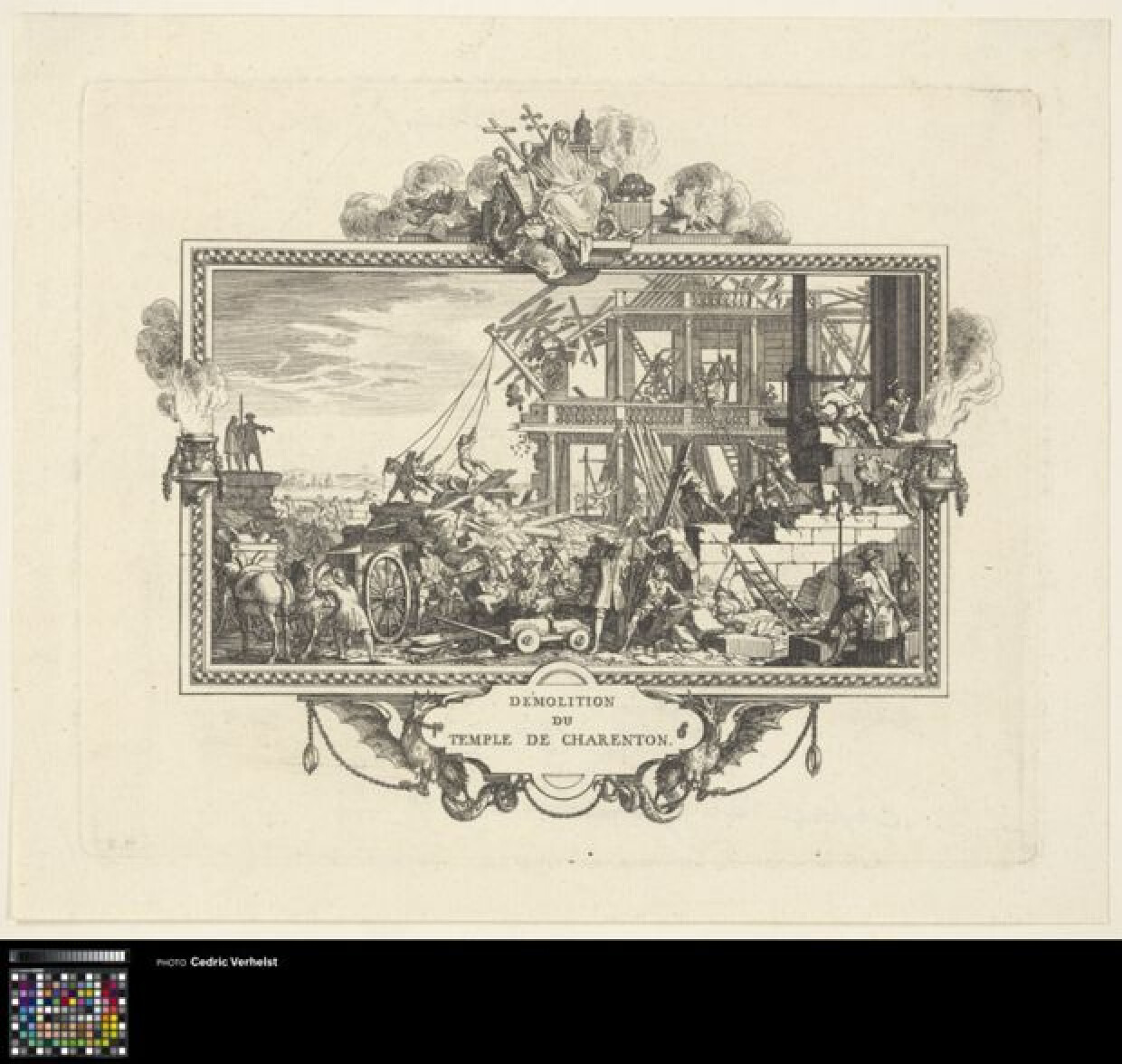18de eeuw 17de eeuwDeze ets maakt deel uit van een reeks van 8 prenten genaamd Les petites Conquêtes du Roi, die de overwinningen van Louis XIV afbeelden. De prent toont de vernieling van een protestantste kerk na het Edict van Fontainebleau uit 1685, dat de protestantse eredienst in Frankrijk verbood. Het edict werd uitgevaardigd door Louis XIV. We zien vele mannen die bezig zijn de kerk handmatig te ontmantelen, door met touwen de pilaren omver te trekken, de balken uit het dak te halen, en met hamers en stokken de stenen muren af te breken. Het puin wordt links in de voorstelling in karren getrokken door paarden afgevoerd. De prent wordt omkaderd door een rechthoekige lijst, aan de bovenzijde gedecoreerd met een heilige op een troon. Links en rechts zijn rokende vaten aan het kader afgebeeld. Onderaan het kader is op een bord de titel van de prent gedrukt. Aan weerszijden wordt het bord geflankeerd door draken.