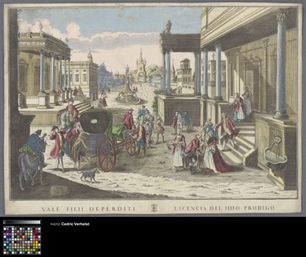 Tweede prent in een serie rond het verhaal van de verloren zoon. De voorstelling toont de jonge man terwijl hij zich voorbereidt om te vertrekken vanuit het huis van zijn vader, verlangend om met zijn rijkdom te vertrekken en naar een ver land te reizen. Een entourage van bedienden makende laatste voorbereidingen. Rechts nemen een bedroefde vader en een betraande moeder afscheid van hun zoon, die knikt voordat hij naar de koets gaat. Links drinkt een jonge man uit een grote fles terwijl hij wacht tot de koffers vastgezet worden. Jonge vrouwen lopen ook rond op het toneel en verzorgen de zoon met eten en drinken.