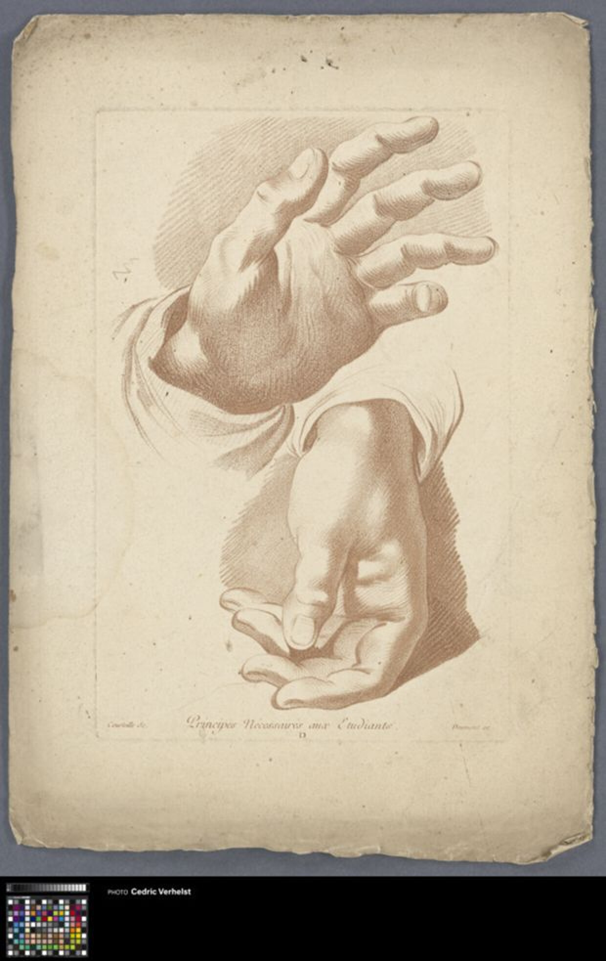 18de eeuwDe studie toont twee handen. De bovenste hand is geopend en de vingers zijn gespreid. De binnenkant van de hand is zichtbaar. De onderste hand is een linkerhand en lijkt te rusten op een oppervlak. Afkomstig uit een publicatie bedoelt voor studenten om tekenprincipes te leren.