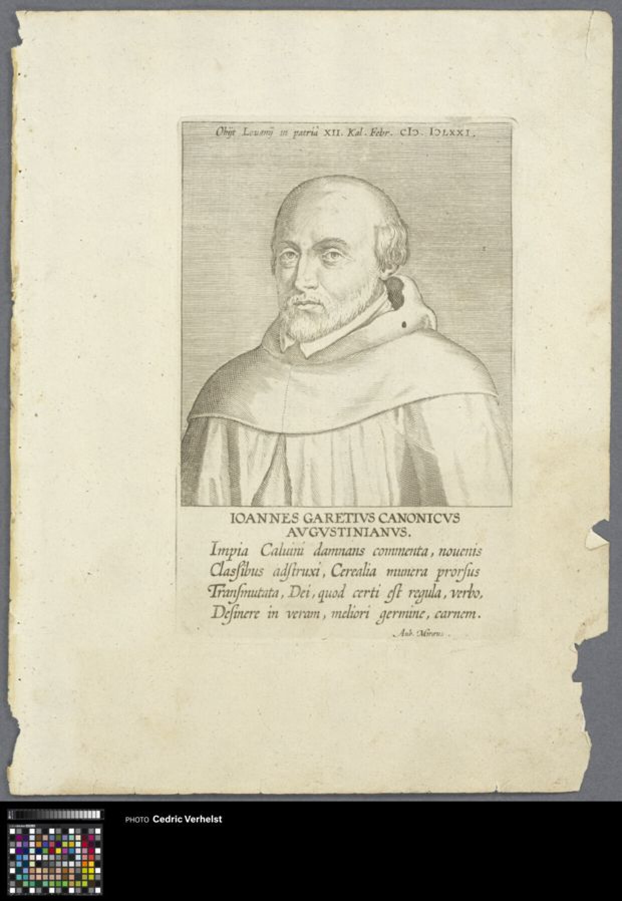 opschrift (in de marge onderaan): IOANNES GARETIVS CANONICVS/ AVGVSTINIANVS./ Impia Caluini damnans commenta, nouenis/ Classibus adstruxi, Cerealia munera prorsus/ Transmutata, Dei, quod certi est regula, verbo,/ Desinere in veram, meliori germine, carnem. / Aub. Mireaus.