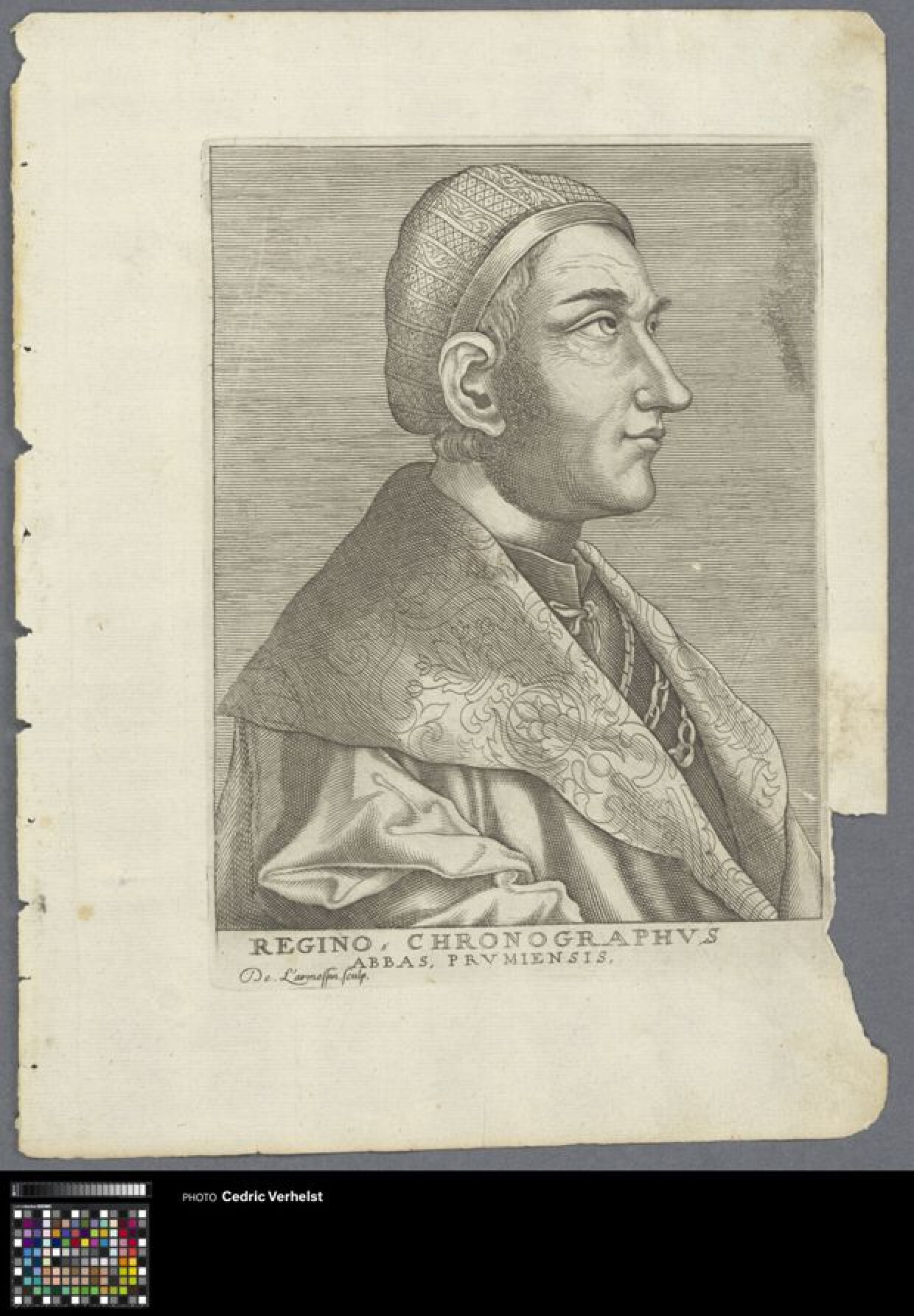 17de eeuwPortrait of Regino, abt van Prüm in buste naar rechts. Boekillustratie uit: Bullart, Isaac. Académie des Sciences et Arts contenant les vies et éloges his. des hommes illustres qui ont excellé en ces professions depuis environ quatre siècles. Brussel: François Foppens, 1682. Met uitgewiste aantekeningen in potlood rond de prent.