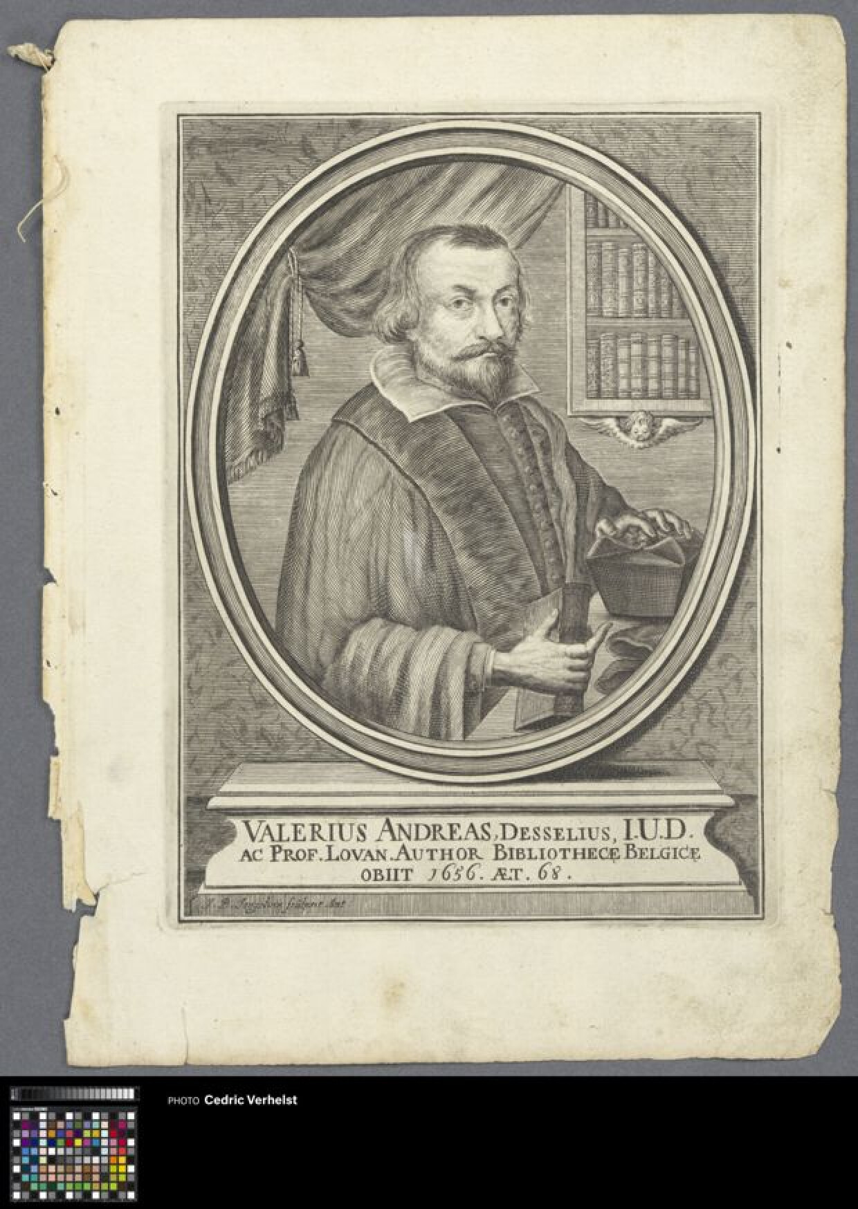 18de eeuwPortret van Valerius Andreas (1588-1655), geschiedschrijver en rechtsgeleerde. Hij is ten halve lijve afgebeeld in een studie en staat lichtjes naar rechts gedraaid. Zijn linkerhand rust op een kardinaalshoed en in zijn rechterhand heeft hij een boek vast. Hij draagt een mantel en een witte kraag. Het opschrift vermeld zijn hoogleraarschap te Leuven en zijn boek Bibliotheca Belgica dat uitgegeven werd in 1623. Deze prent komt vermoedelijk uit de tweede uitgave van dat boek.