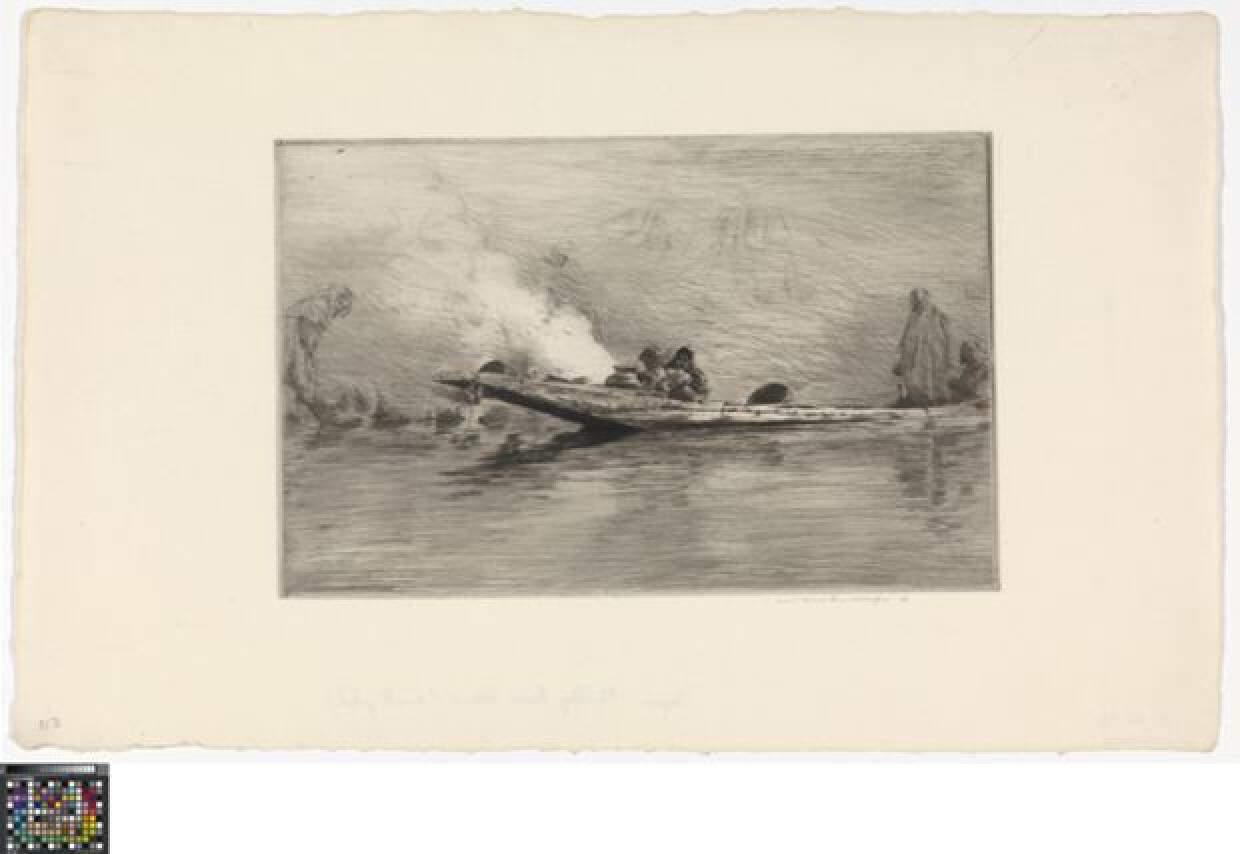19de eeuw 20ste eeuwDeze prent toont een bootje met mensen op een rivier. De boot is lang en plat, met een opstaande voorkant, en ligt aangemeerd aan de oever. Vooraan in de boot staan een aantal potten, erachter zit een kindje met naast hem een zittende vrouw. Ze heeft haar knieën tegen haar lichaam opgetrokken, haar armen erover heen gekruist, en rust met haar hoofd op haar armen. Ze kijkt naar de toeschouwer. Achterin de boot staan nog twee figuren in lange mantels die ook het hoofd bedekken. Links in de marge staat een figuur op de oever. Het water, de oever en de achtergrond zijn grijs en tonen niet veel van de omgeving. Links in de voorstelling is een witte rookwolk afgebeeld.
