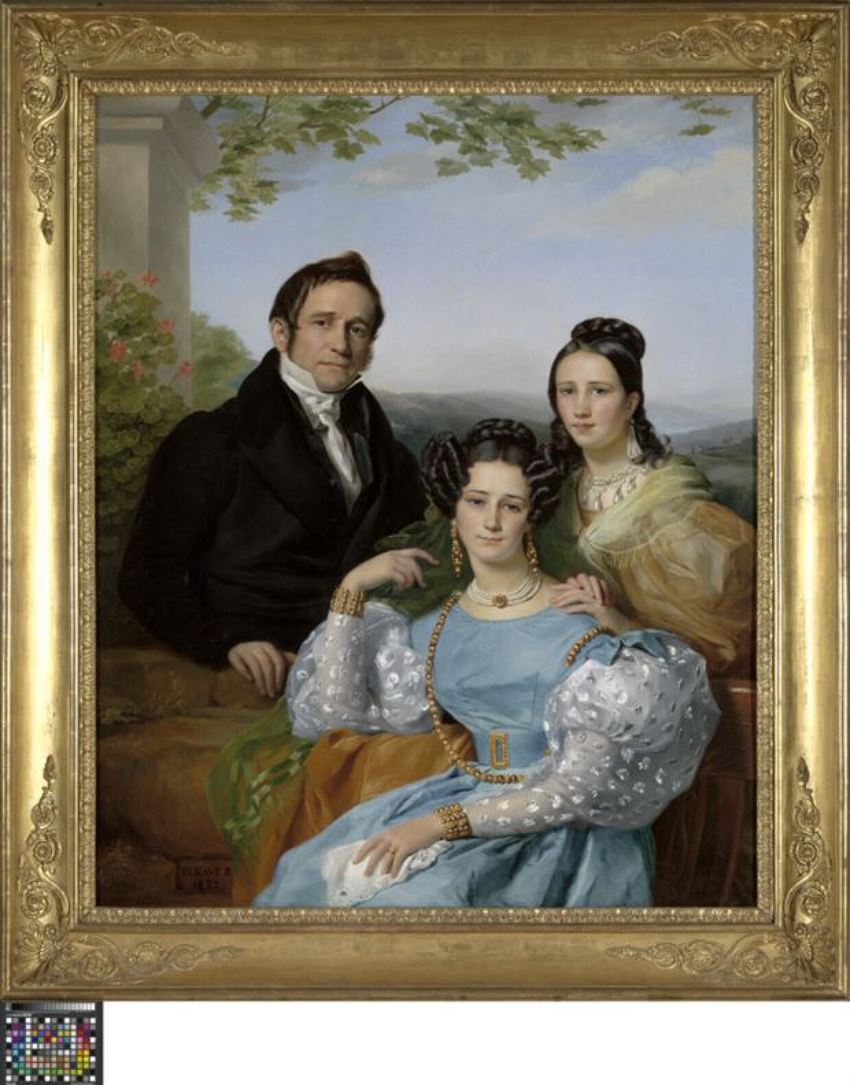 19de eeuwFamilieportret van Théodore Joseph Jonet met zijn twee dochters. Waarschijnlijk liet Jonet, die in 1832 reeds weduwnaar was, dit portret schilderen net vóór het huwelijk van zijn oudste dochter Juliette met de geneesheer Joseph Emile Lequime. Dit schilderij is vervaardigd door de schilder François-Joseph Navez, ongeveer tien jaar na zijn reis naar Rome en twee jaar na de stichting van een onafhankelijk België in 1830. Ondanks deze woelige tijden bleef de schilder aan het werk voor de Brusselse bourgeoisie. Jonet kende Navez al heel lang en bestelde twintig jaar eerder al een portret bij hem. Dit genre van familieportret zou erg populair worden in dit Brusselse milieu.