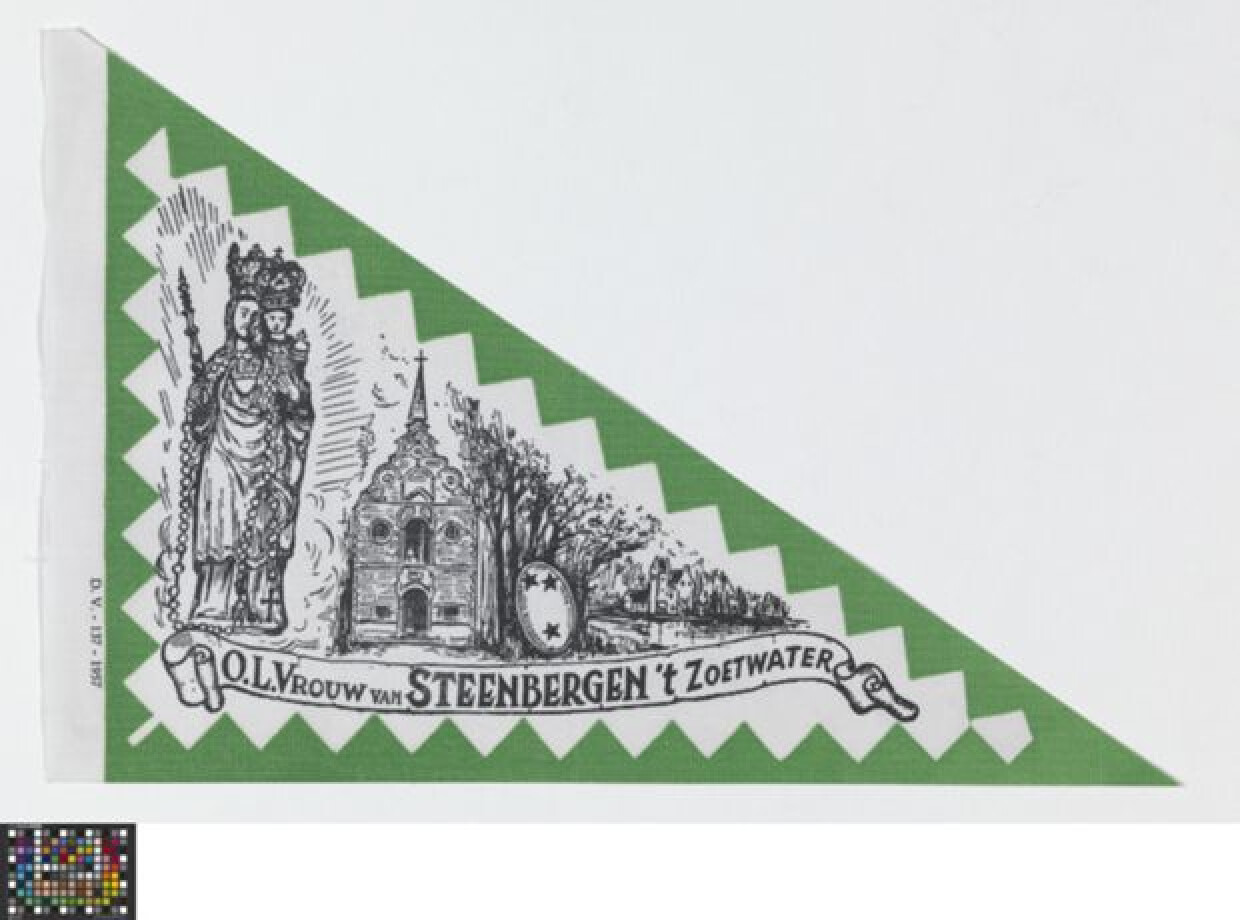 20ste eeuwBedevaartvaantje van linnen. O. L. Vrouw van Steenbergen 't Zoetwater. Oud-Heverlee. Rechthoekige driehoek van links naar rechts. Zwart-wit druk met doorlopende, gekartelde groene rand. Vaantje uitgegeven door De Vaantjesboer iin 1957. Links de weergave van Onze Lieve Vrouw met kind op de arm en scepter in de hand. Rond haar hals hangt een grote rozenkrans tot op de grond. Beiden zijn gekroond en omgeven door een stralenkrans. Centraal staat de voorgevel van de kapel, met enkele bomen ernaast en een ovaal wapenschild met drie sterren. Rechts is één van de vijf vijvers zichtbaar die 'Het Zoet Water' heten, met op de oever in de verte een gebouw 'Het Spaans dak'. Onderaan een grote banderol met het opschrift 'Steenbergen 't zoetwater'.