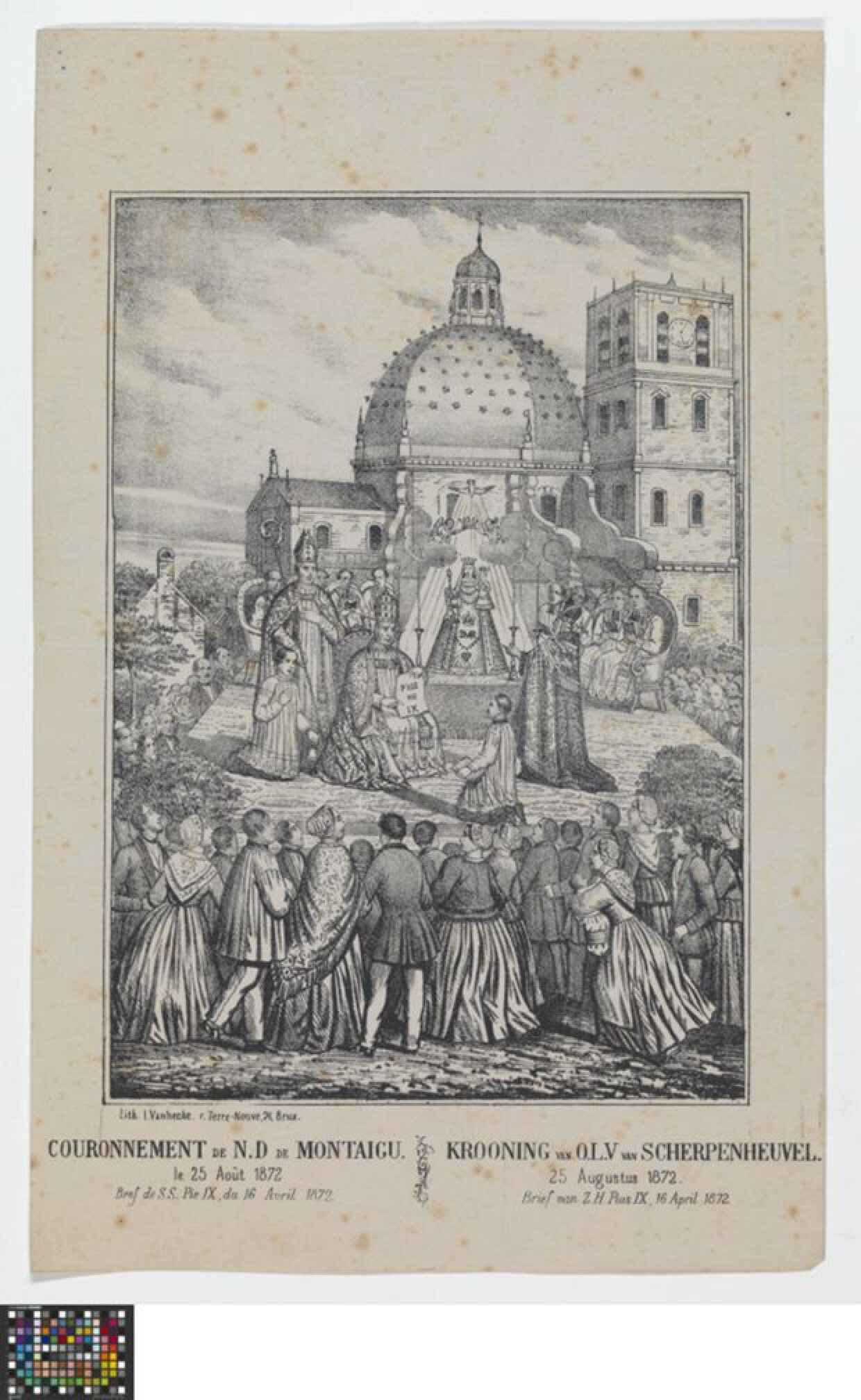 19de eeuwRechthoekige prent van papier. Onze Lieve Vrouw van Scherpenheuvel. Litho van I. Vanhecke uit Brussel. Op de prent staat de kroning van O.L.V. van Scherpenheuvel afgebeeld. Op een podium voor de basiliek staat het beeld van O.L.Vrouw met kind en scepter. Errond en ervoor zitten verschillende geestelijken, waaronder kardinaal Deschamps, die de opdracht kreeg van paus Pius IX om het beeld pauselijk te kronen. Rond het podium staat een grote menigte aandachtig te kijken. De prent draagt het tweetalig onderschrift 'Krooning van O.L.V. van Scherpenheuvel, 25 Augustus 1872. BRief van Z.H. Pius IX, 16 April 1872.'