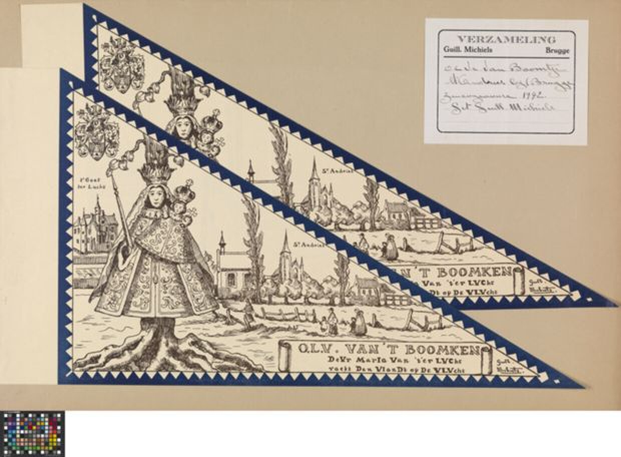 20ste eeuwTwee bedevaartvaantjes van papier, rechthoekige driehoek van links naar rechts. Zwart-wit prent met brede blauwe getande rand. Zincogravure uit 1942, van Guillaume Michiels. Centraal links staat een lindeboom met daarop Maria met kind op de linkerarm. Op de achtergrond is kasteel 't goed ter lucht' zichtbaar, met daarboven een wapenschild (van de adellijke familie de la Coste), en rechts de kapel en de parochiekerk van Sint Andries. Op de voorgrond een weg waarop enkele bedevaarders lopen richting kerk (de kinderen houden een bedevaartvaantje in de hand). Onderaan rechts staat op een banderol 'O.L.V. van 't Boomken - deur Maria van 't'er lucht, raekt den viandt op de vlucht'. Uiterst rechts in de hoek staat de naam van de ontwerper Guillaume Michiels. De spreuk op het vaantje werd overgenomen van de originele devotieprent van Van Caukercken uit 1666 (zie BMV.03615)