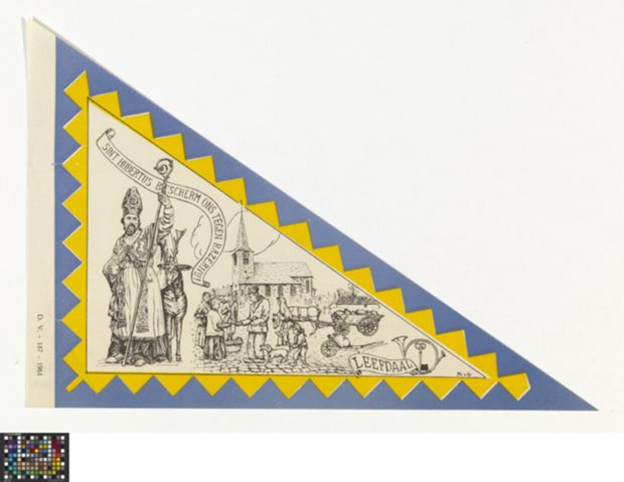 20ste eeuwBedevaartvaantje van papier, St. Hubertus te Leefdaal, type De Vaantjesboer. Rechthoekige driehoek van links naar rechts. Brede, blauwgele getande rand rondom. Verspreid door De Vaantjesboer in 1961. Links staat St. Hubertus, voorgesteld als bisschop, met mijter op het hoofd en staf in de hand. Naast hem staat een hert met een kruis tussen zijn gewei. Boven hen een banderol met opschrift 'Sint Hubertus bescherm ons tegen razernij'. Rechts ernaast een zicht op de St. Lambertuskerk met plein ervoor. Daar staat een vaantjesboer vaantjes te verkopen aan enkele volkse figuren. Een kind houdt een vaantje in de hand, terwijl hij aan de staart van een hond trekt. In de rechterhoek een hoorn met sleutel erin en banderol 'Leefdaal' eromheen. Uiterst rechts een handtekening 'MM + FF".