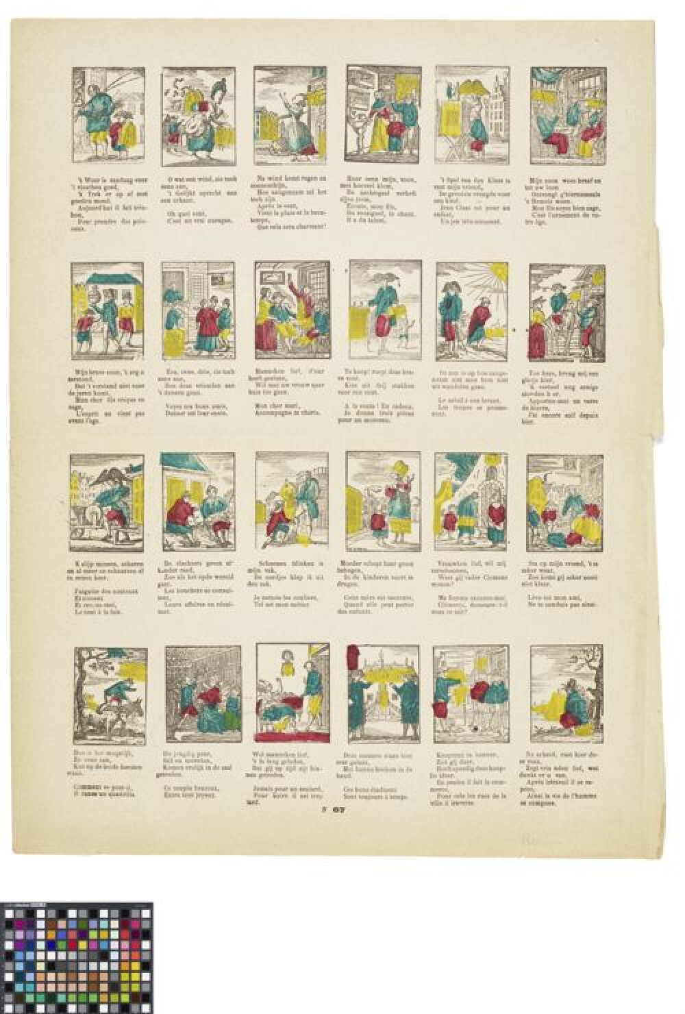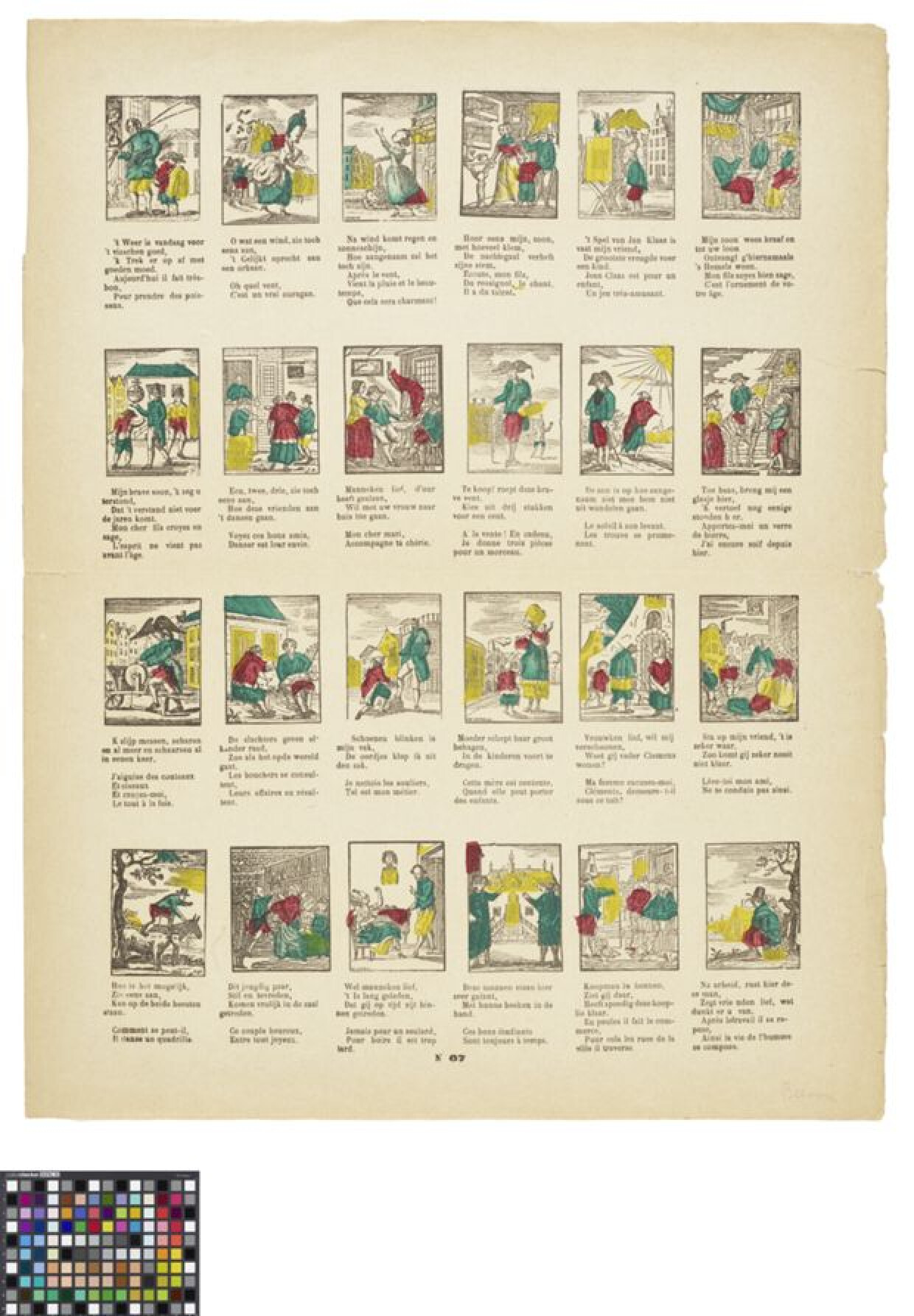 (1870 - 1892)Prent over het weer en dagdagelijkse gebeurtenissen. Op gedeelte in 24 taferelen, onder elke scène is een tweetalig rijmpje in het Nederlands en het Frans leesbaar. De taferelen bevatten verschillende figuren die activiteiten doen. In het eerste tafereel zijn een man en een jongetje zichtbaar. Het onderschrift vertelt dat de man en de jongen gaan vissen door het mooie weer. In het laatste tafereel is een zittende man zichtbaar, hij rust onder een boom na zijn werk. Rond 1870 nam Beersmans de houtblokken voor mannekensbladen over van Antoine Van Genechten. Deze waren afkomstig van de verdeling van hun vroegere vennootschap Glénisson & Van Genechten (1833 – 1856), die eerder houtblokken voor mannekensbladen had overgenomen uit het fonds “Joh. Noman en Zoon” te Zaltbommel. Deze prent is een herdruk van prent nr. 114 uit het fonds Noman.