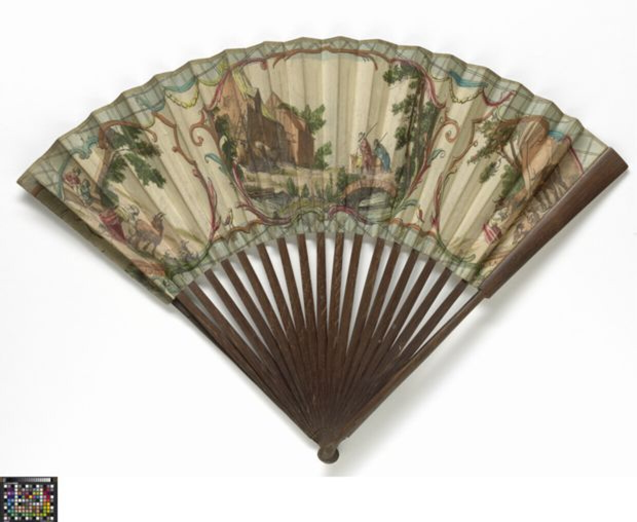 (circa 1725 - circa 1735)Tot ver in de 19de eeuw waren waaiers zeer populair bij vrouwen die elegant voor de dag wilden komen. De luxueuze uitvoering, bijvoorbeeld met ivoor, parelmoer of email onderstreepte meteen ook de rijkdom van de bezitster. Deze waaier is gemaakt van eenvoudig papier en benen van zitanhout. Het lijkt op het eerste gezicht geen bijzondere waaier, maar het is een echte Chinese waaier die meegebracht is via de Aziatische handelsroutes. Chinoiserieën zijn fel gegeerd bij de 18de eeuwse burgerij.